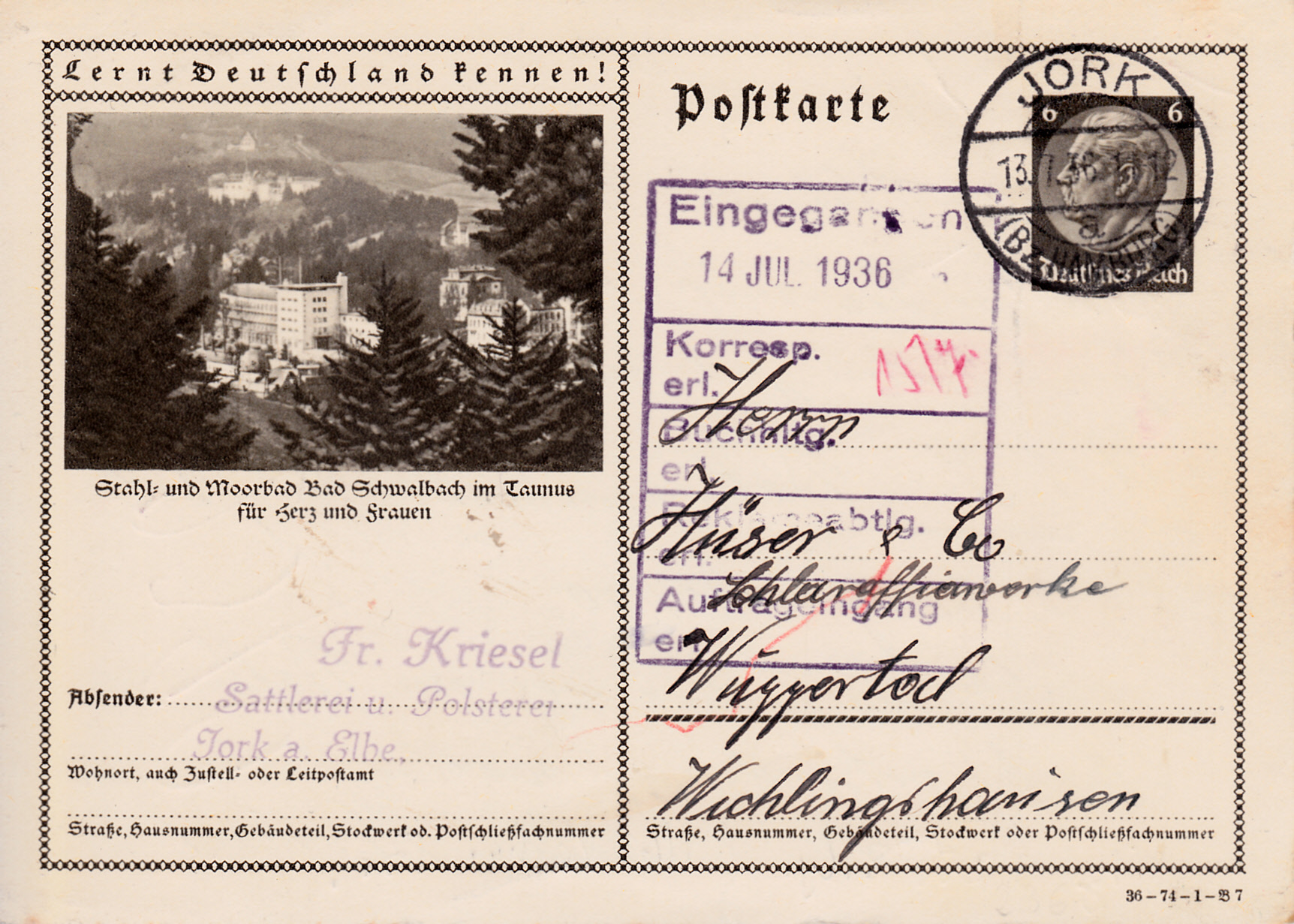 Bad Schwalbach ist in der Ausgabe 1936 wieder mit einer Karte (Serie 74 Bild 7) vertreten und zeigt ein ähnliches Foto wie 1933 und 1934.