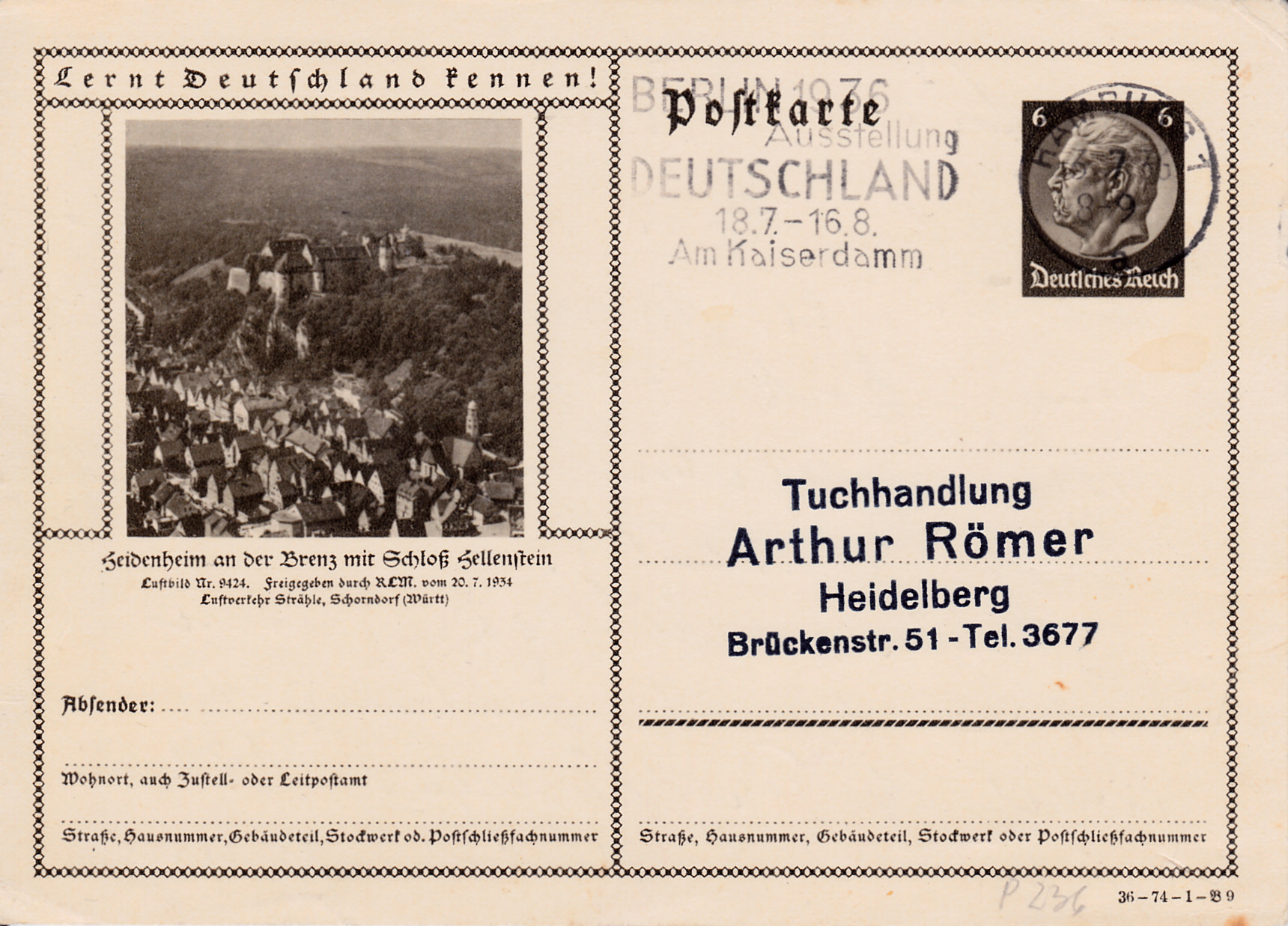 Heidenheim an der Brenz ist 1936 mit einer Bildpostkarte (Serie 74 Bild 9) mit einem Luftbild von Heidenheim und der Burg Hellenstein vertreten.