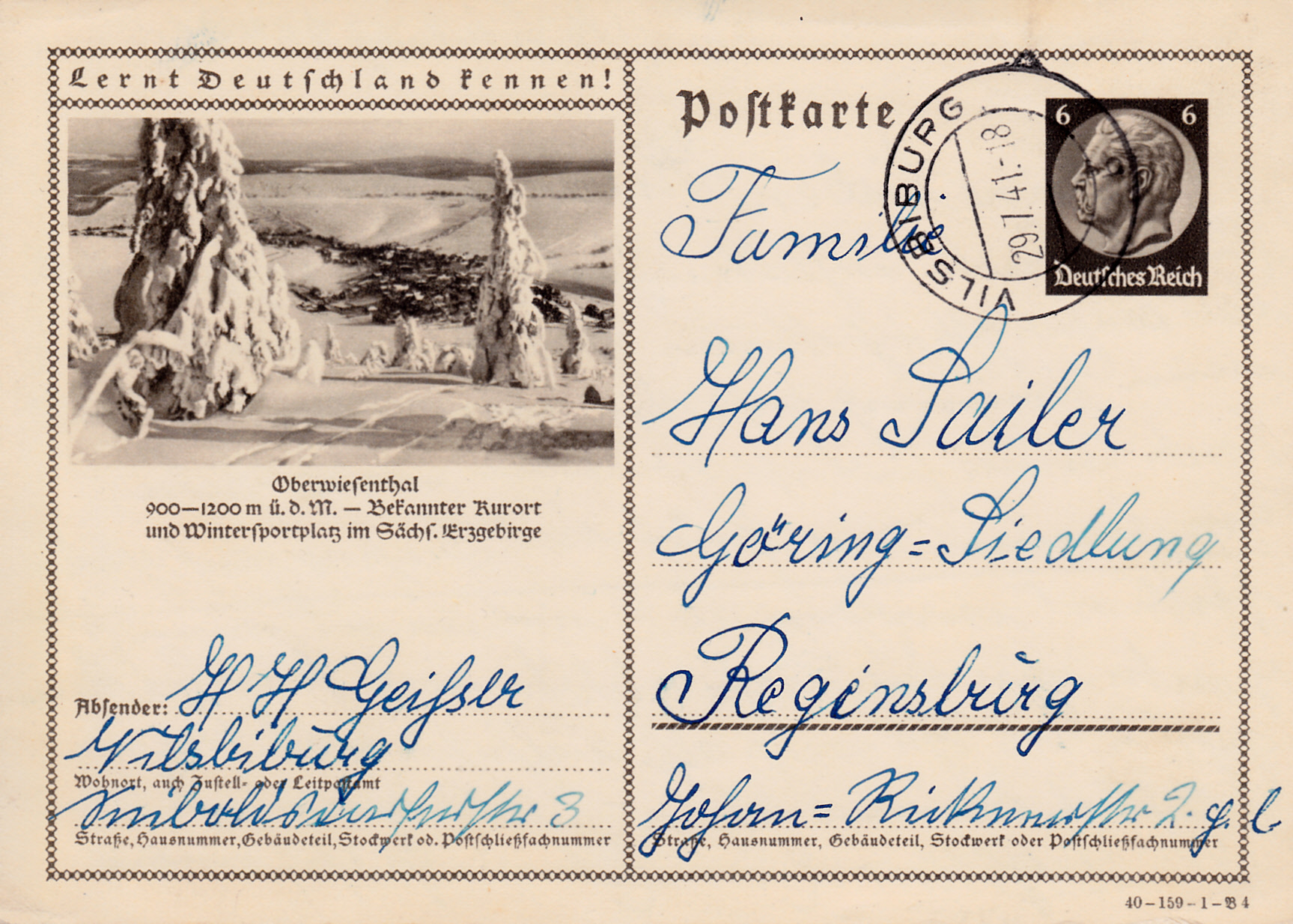 Auf dieser Karte (Serie 159 Bild 3) 1940 stellt sich Oberwiesenthal als Kur- und Wintersportort vor.