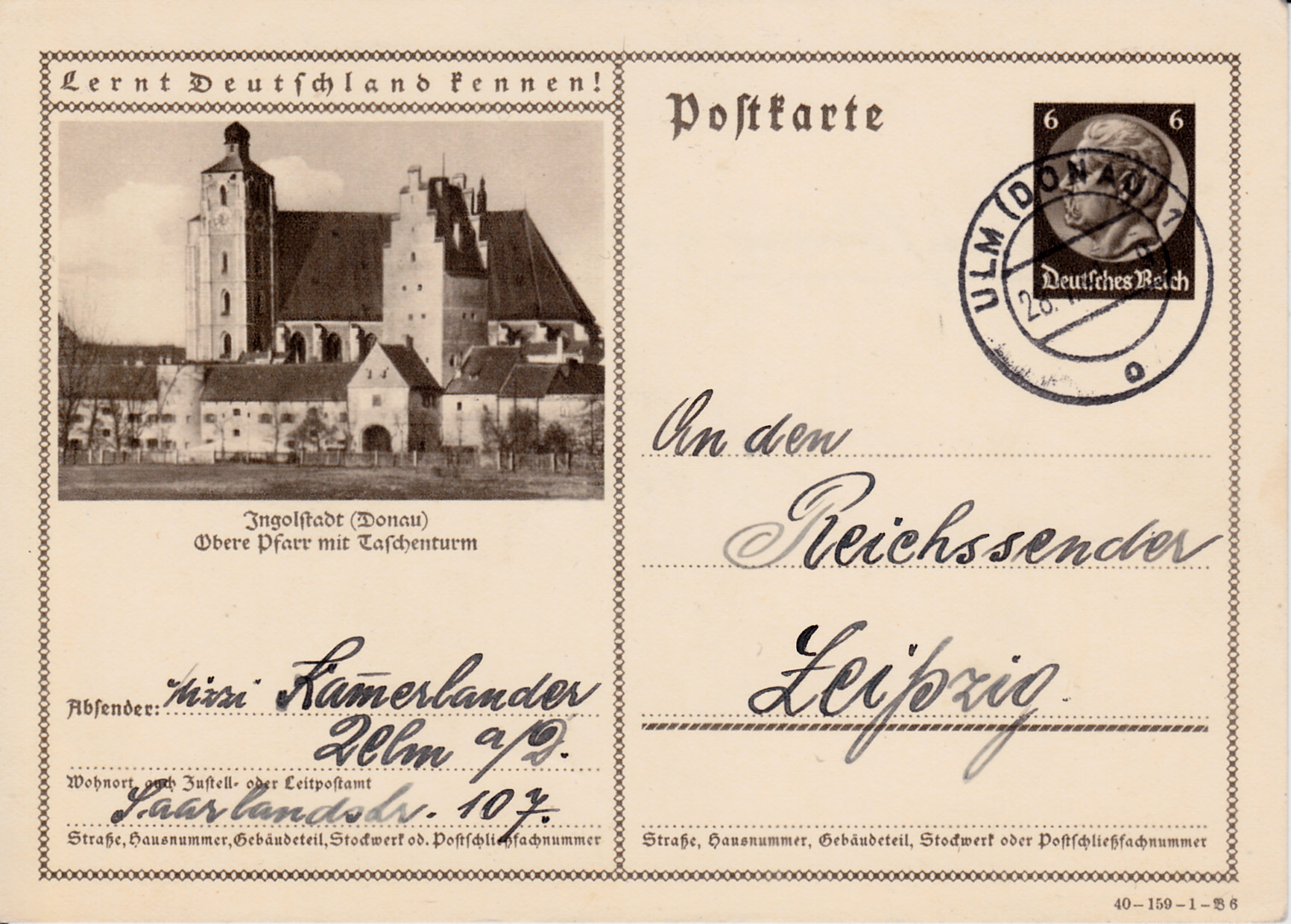 Auf dieser Karte (Serie 159 Bild 6) zeigt Ingolstadt das Liebfrauenmünster (Obere Pfarr) mit dem Taschenturm.
