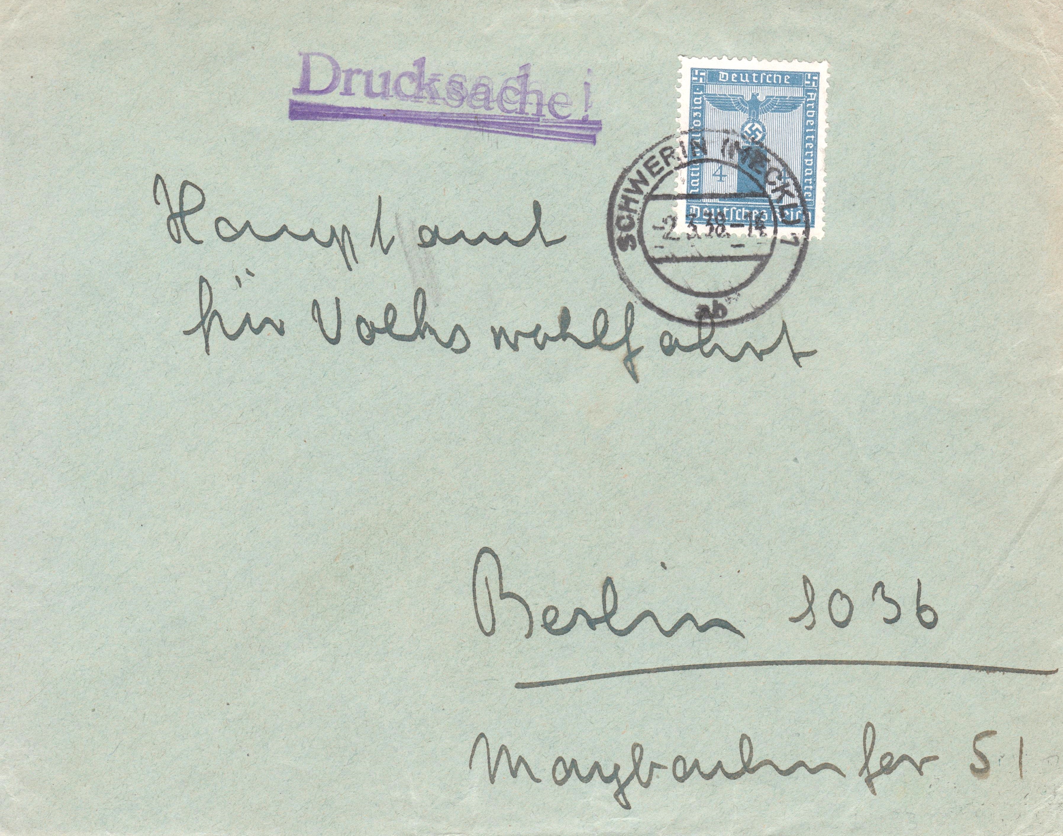 Hier eine Einzelfrankatur der Dienstmarke Deutsches Reich MiNr. 146 am 02.03.1938 portogerecht auf einer Drucksache: