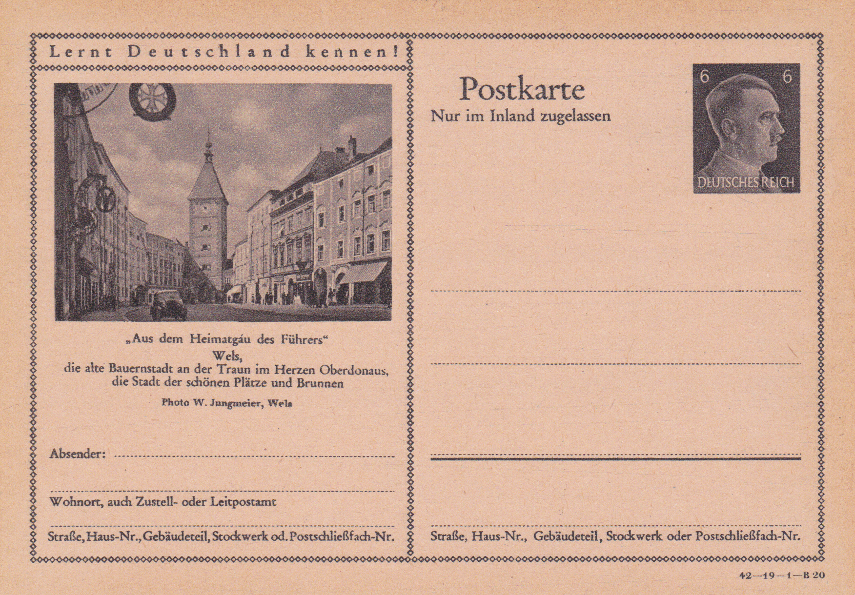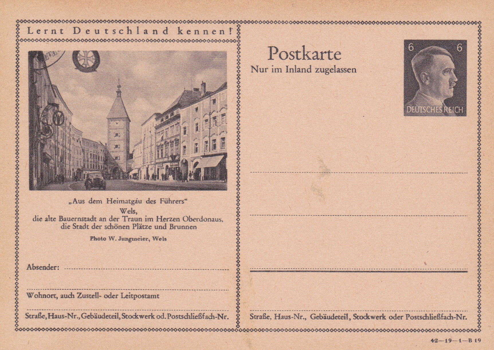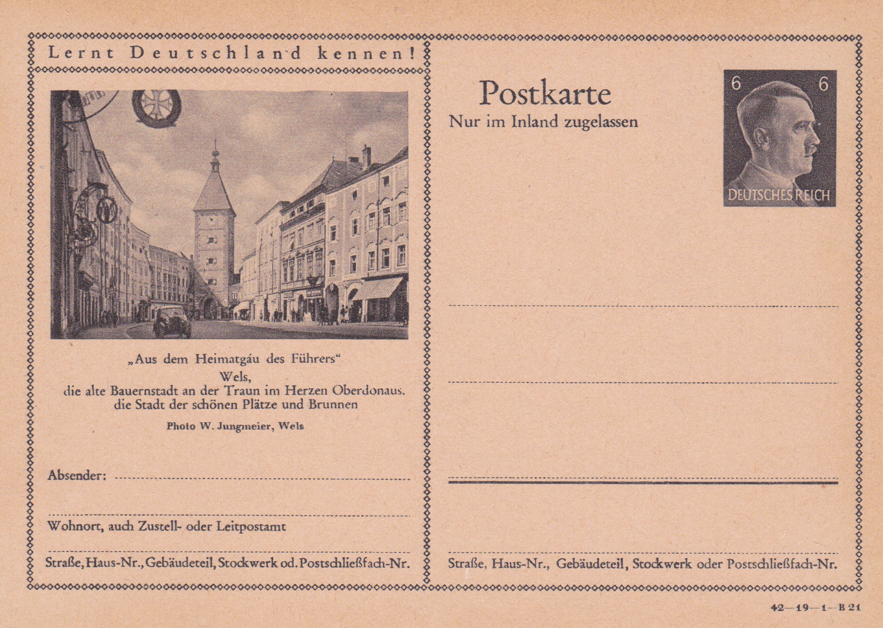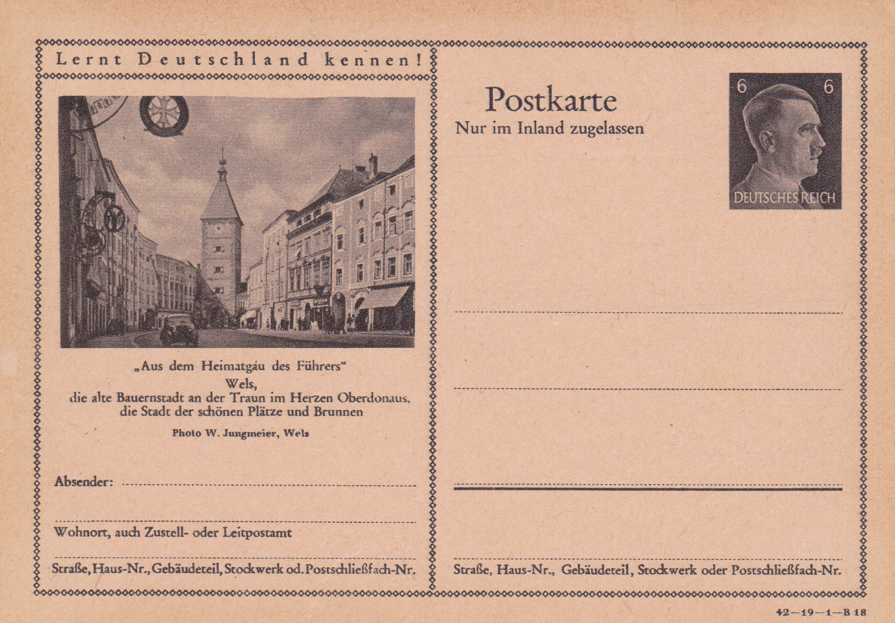 Wels, eine Stadt im oberösterreichischen Alpenvorland, zeigt auf einer Bildpostkarte 1942 (Serie 19 Bild 16) eine Ansicht mit dem Ledererturm, dem Wahrzeichen der Stadt.