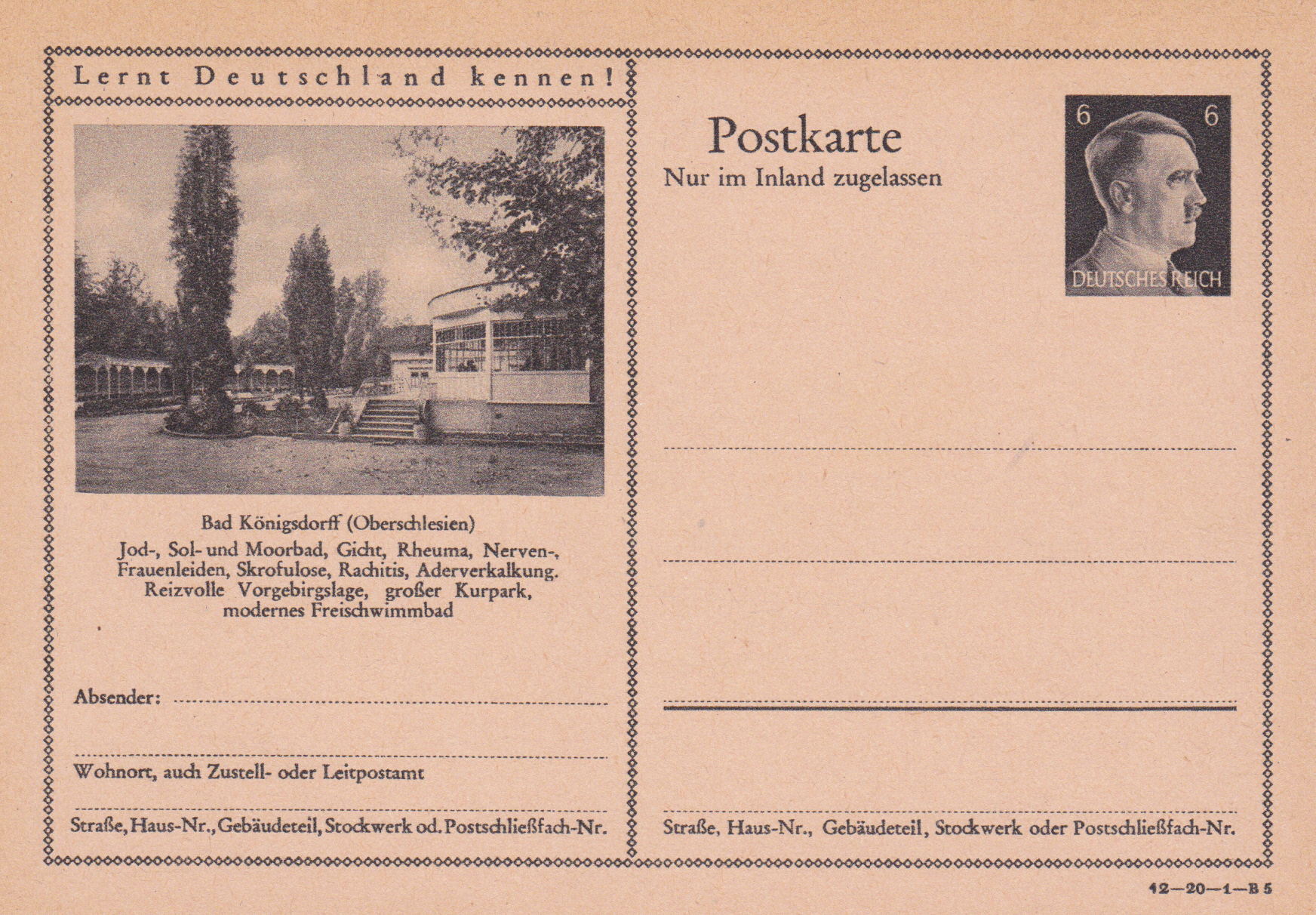 Bad Königsdorff (Oberschlesien) wirbt mit dieser Bildpostkarte (Serie 20 Bild 4) als Jod-, Sol- und Moorbad. Bad Königsdorff heißt heute Jastrzębie-Zdrój und ist eine oberschlesische Stadt im Süden Polens. Sie liegt rund 100 km westlich von Krakau sowie etwa 30 km nordöstlich von Ostrava in unmittelbarer Nähe der tschechischen Grenze.