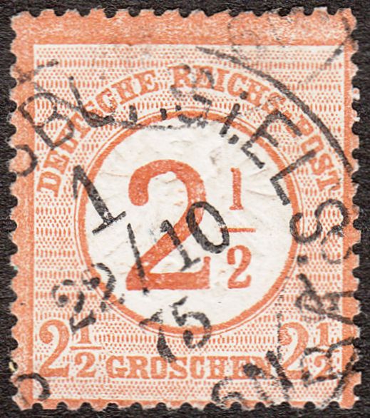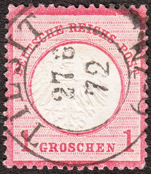 Hier eine nach links oben dezentrierte MiNr. 18, entwertet am 26.06.1875, also eine Weiterverwendung als 5 Pfennige zur Zeit der Markwährung, per Kreisstempel TRIER: