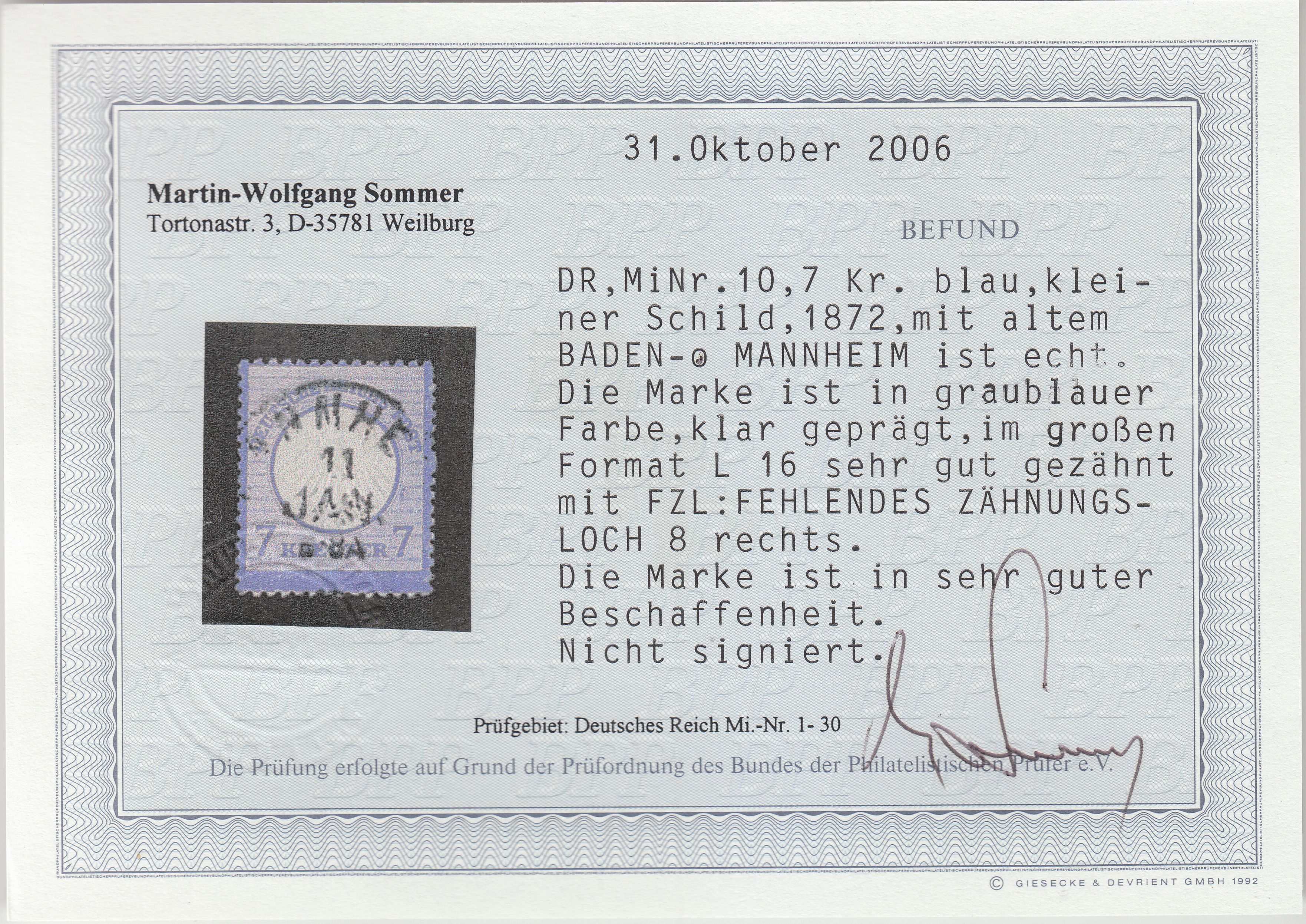 Es handelt sich um eine MiNr. 10 L16 FZL r8, entwertet per nachverwendetem, badischem Kreisstempel MANNHEIM, Feuser BN 295, die ich nach heftigem Bieterkampf für 27,49 € inklusive Porto bei ebay ersteigert habe: