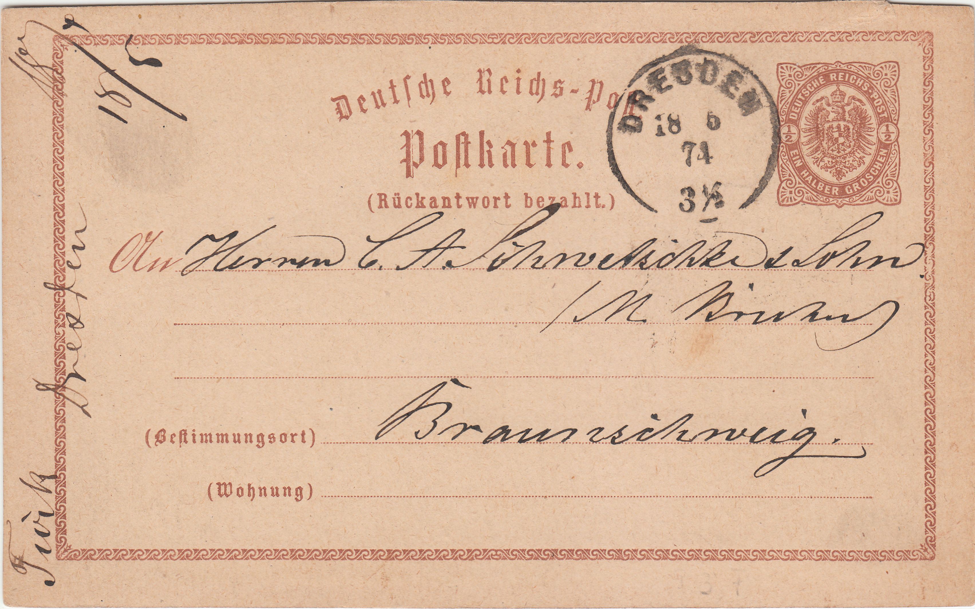 Hier eine Antwortkarte als Ganzsache MiNr. P3A, entwertet am 18.05.1874 per Kreisstempel DRESDEN: