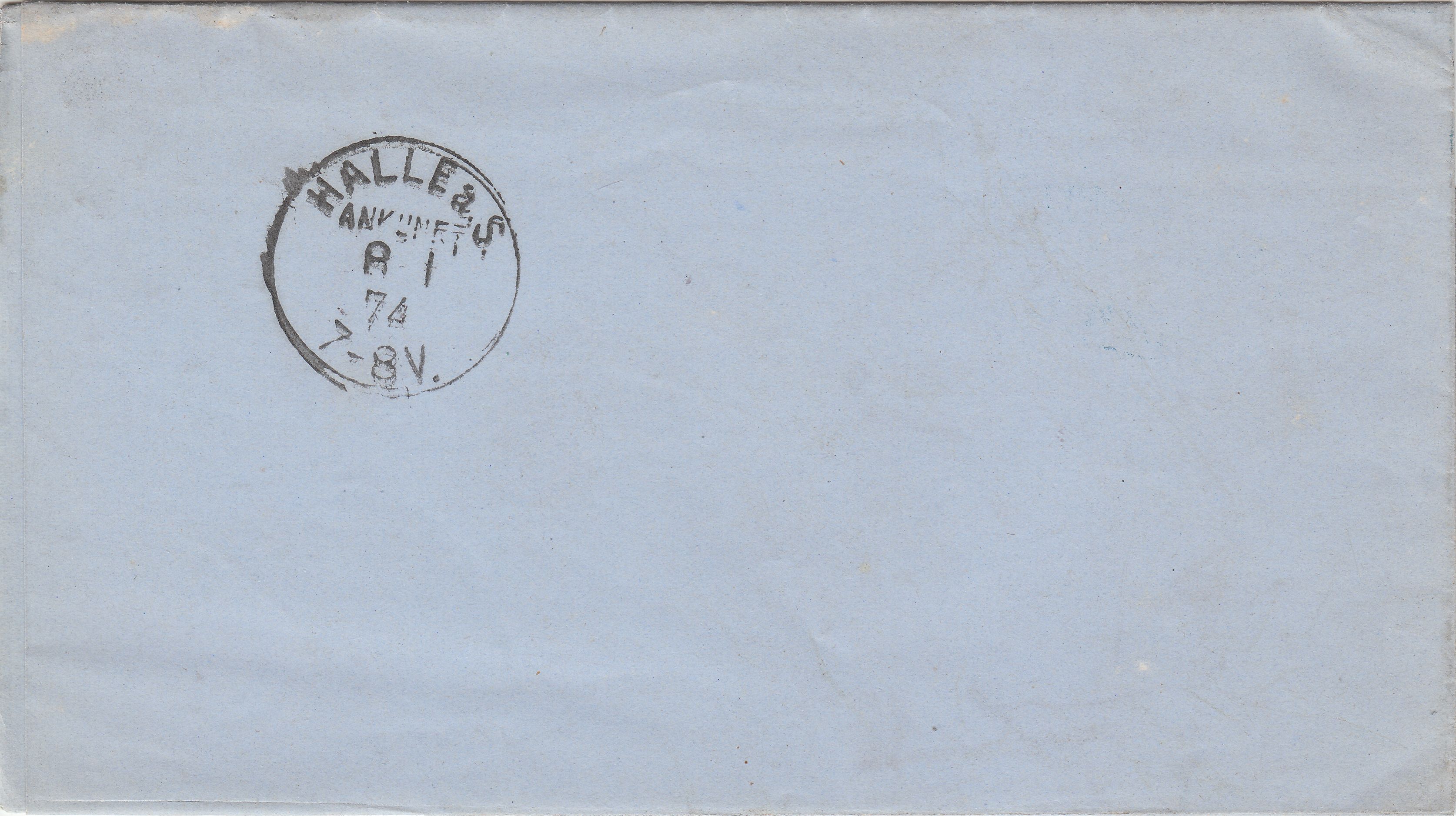 Rückseitig ein Ankunftstempel HALLE a.S. vom 08.01.1874: