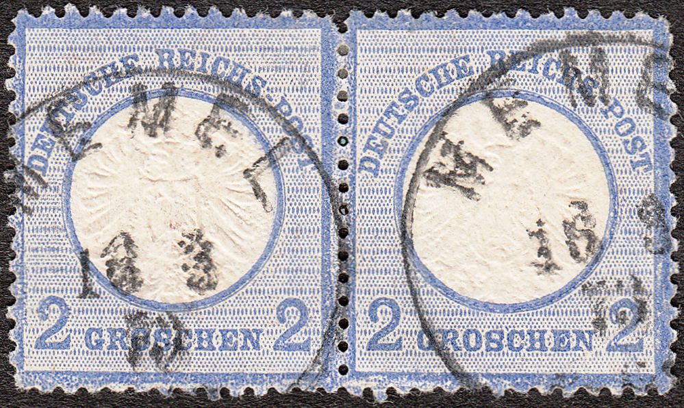 Hier ein Paar der MiNr. 20 mit leicht nach unten verschobener Prägung, entwertet am 16.03.1873 per Kreisstempel "MEMEL":