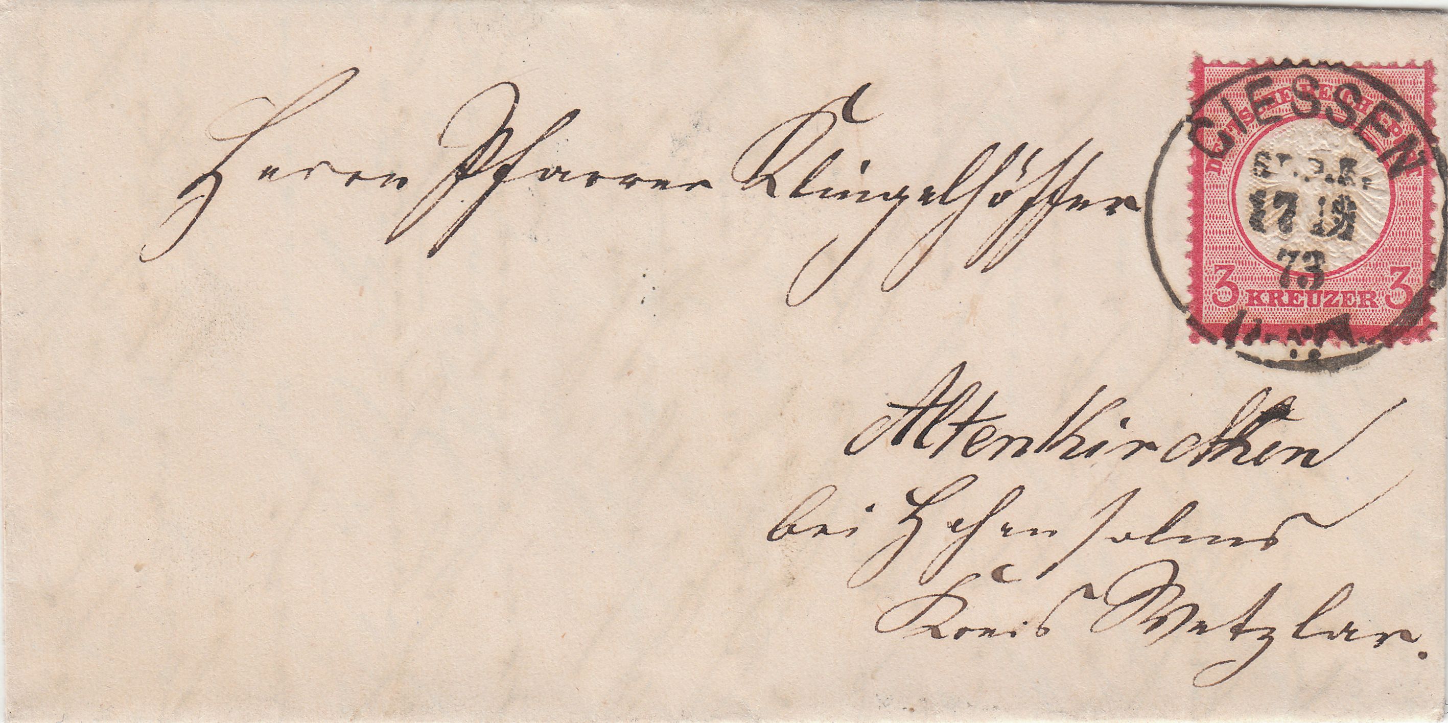Hier eine Einzelfrankatur der MiNr. 25 am 17.12.1873 auf Brief, entwertet per nachverwendetem, preussischem Kreisstempel "GIESSEN ST. P. E.", Feuser Pr 1118, adressiert "Herrn Pfarrer Klingelhöffer Altenkirchen bei Hohensolms Kreis Wetzlar":