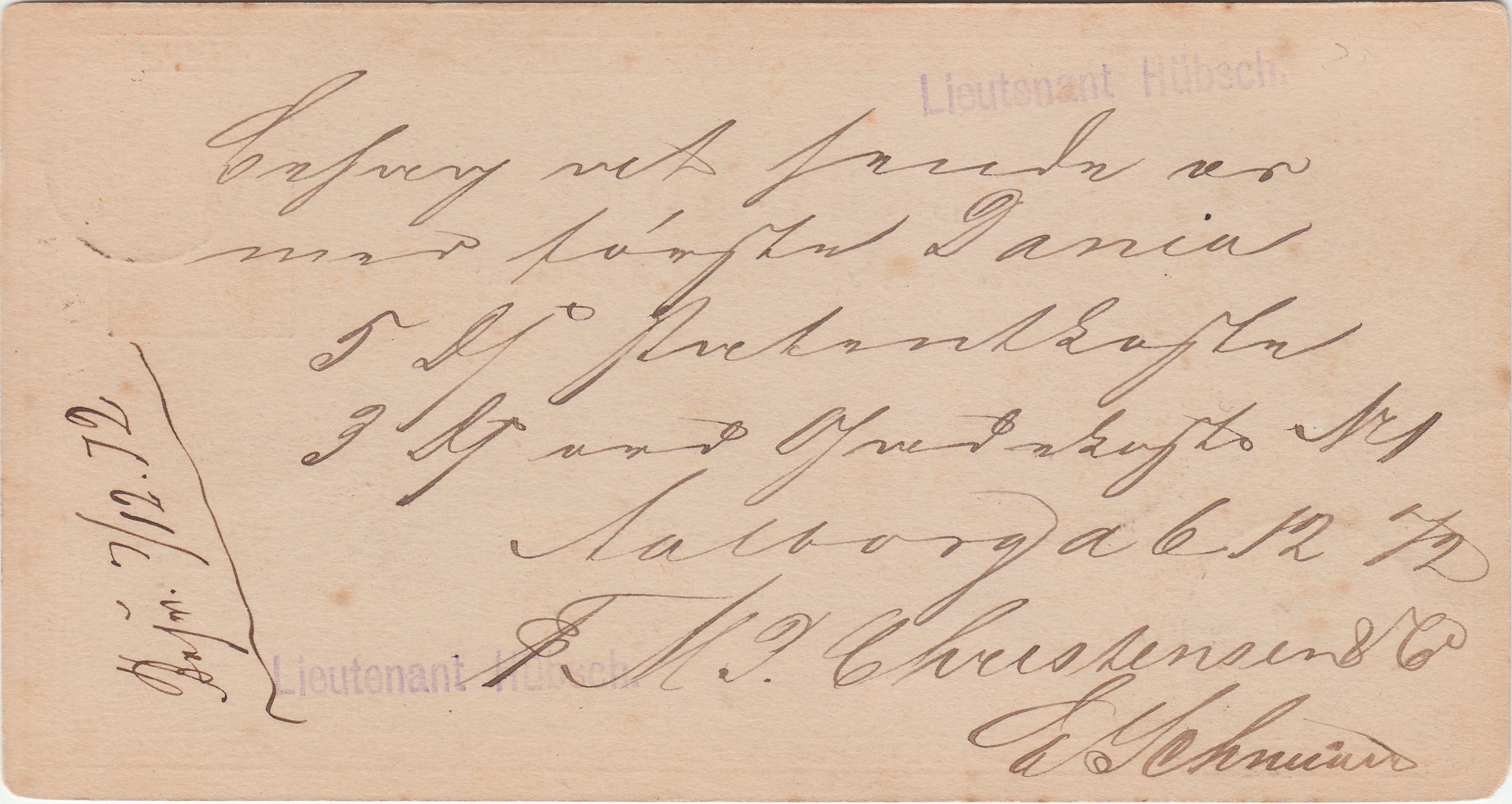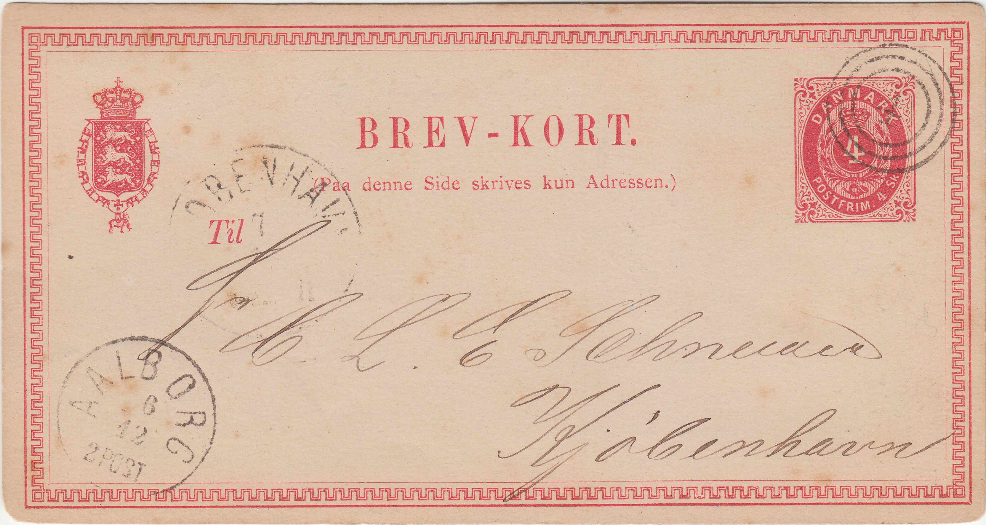 Hier eine Ganzsache Dänemark MiNr. P2, aufgegeben am 06.12.1872, also während des Gültigkeitszeitraums der Brustschildmarken, in Aalborg, entwertet per Dreiringstrmpel mit Nummer "4" = Aalborg sowie nebengesetztem Kreisstempel "AALBORG":