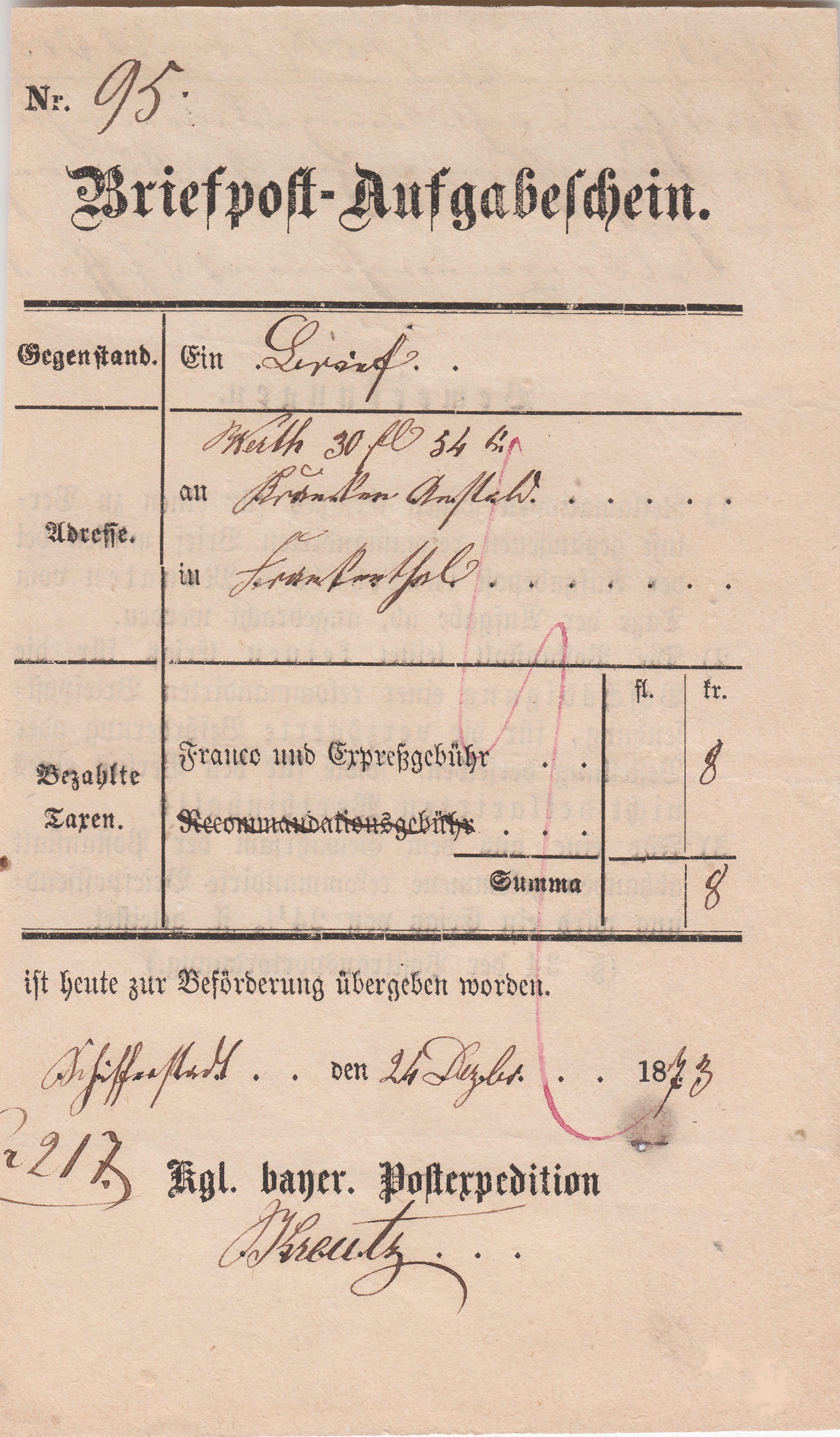 Hier ein Vordruck "Briefpost-Aufgabeschein." der "Kgl. bayer. Postexpedition", ausgestellt am 24.12.1873 (Heiligabend!) in "Schifferstadt" für einen "Brief" an die "Kranken-Anstalt" in "Frankenthal":