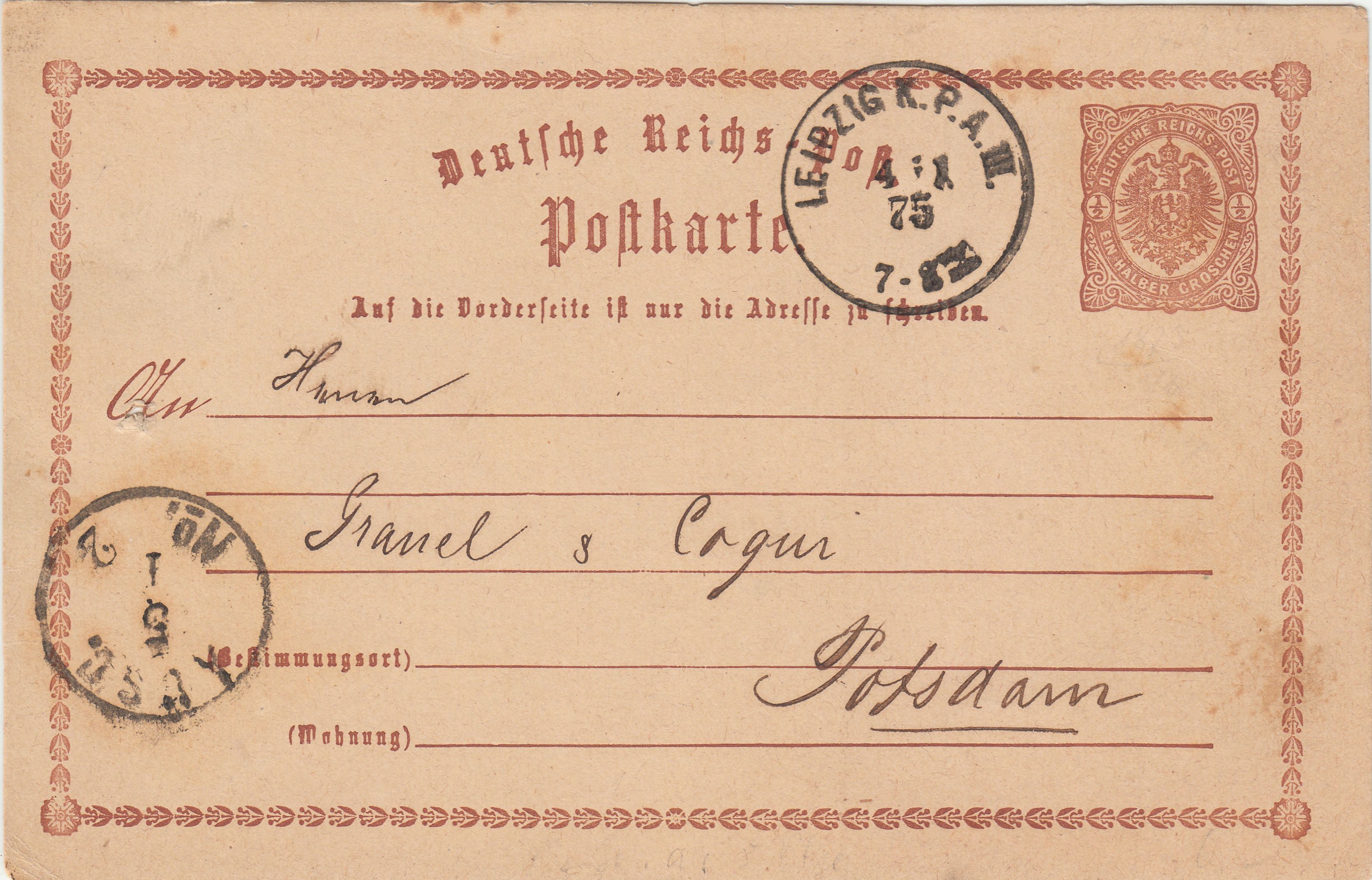 Hier eine Ganzsache MiNr. P1, am 04.01.1875, also als Weiterverwendung zur Zeit der Markwährung, entwertet per Kreisstempel "LEIPZIG K. P. A. III":