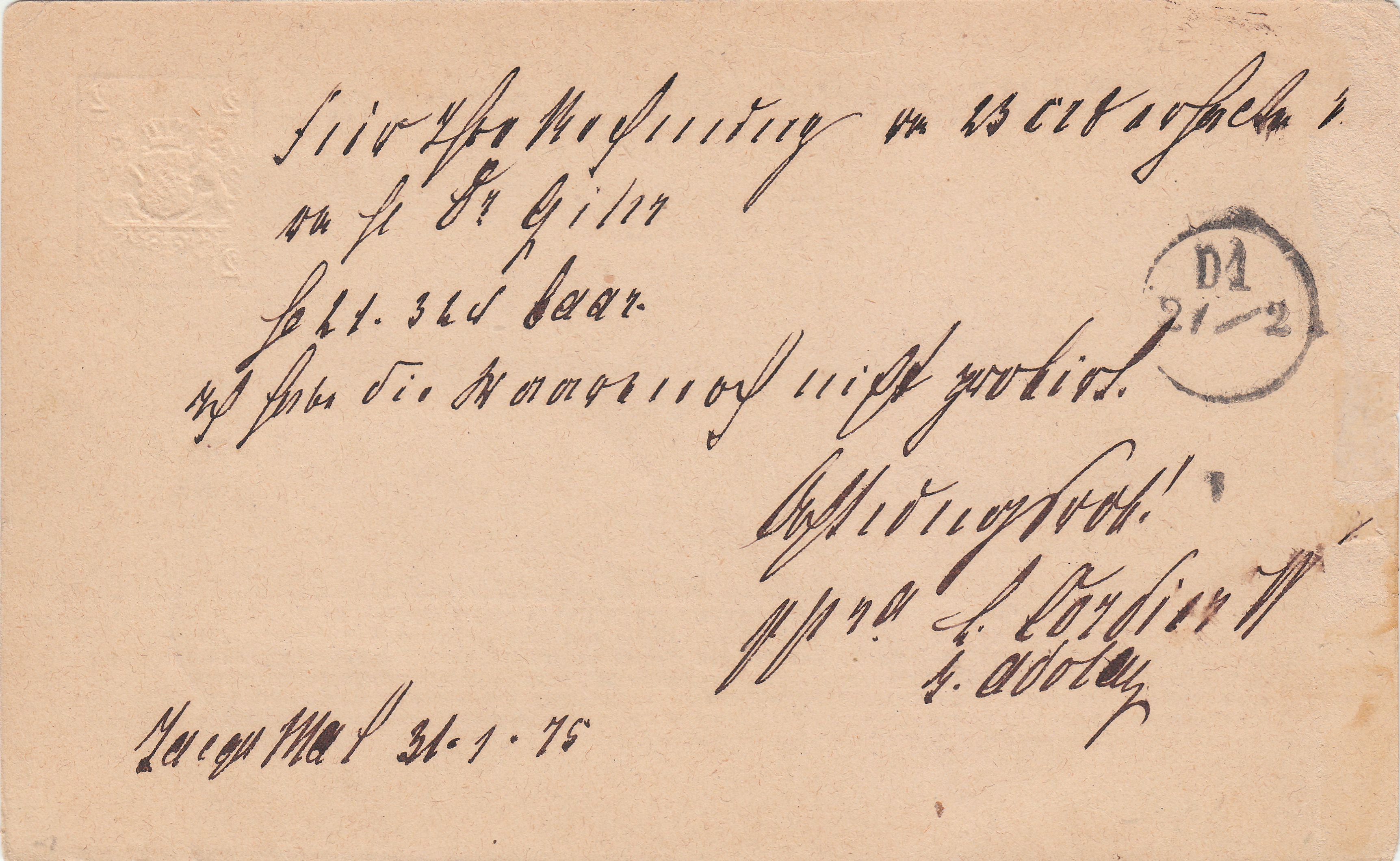 Rückseitig wurde am 02.02.1875 in Stuttgart ein Distributionsstempel "D1" abgeschlagen: