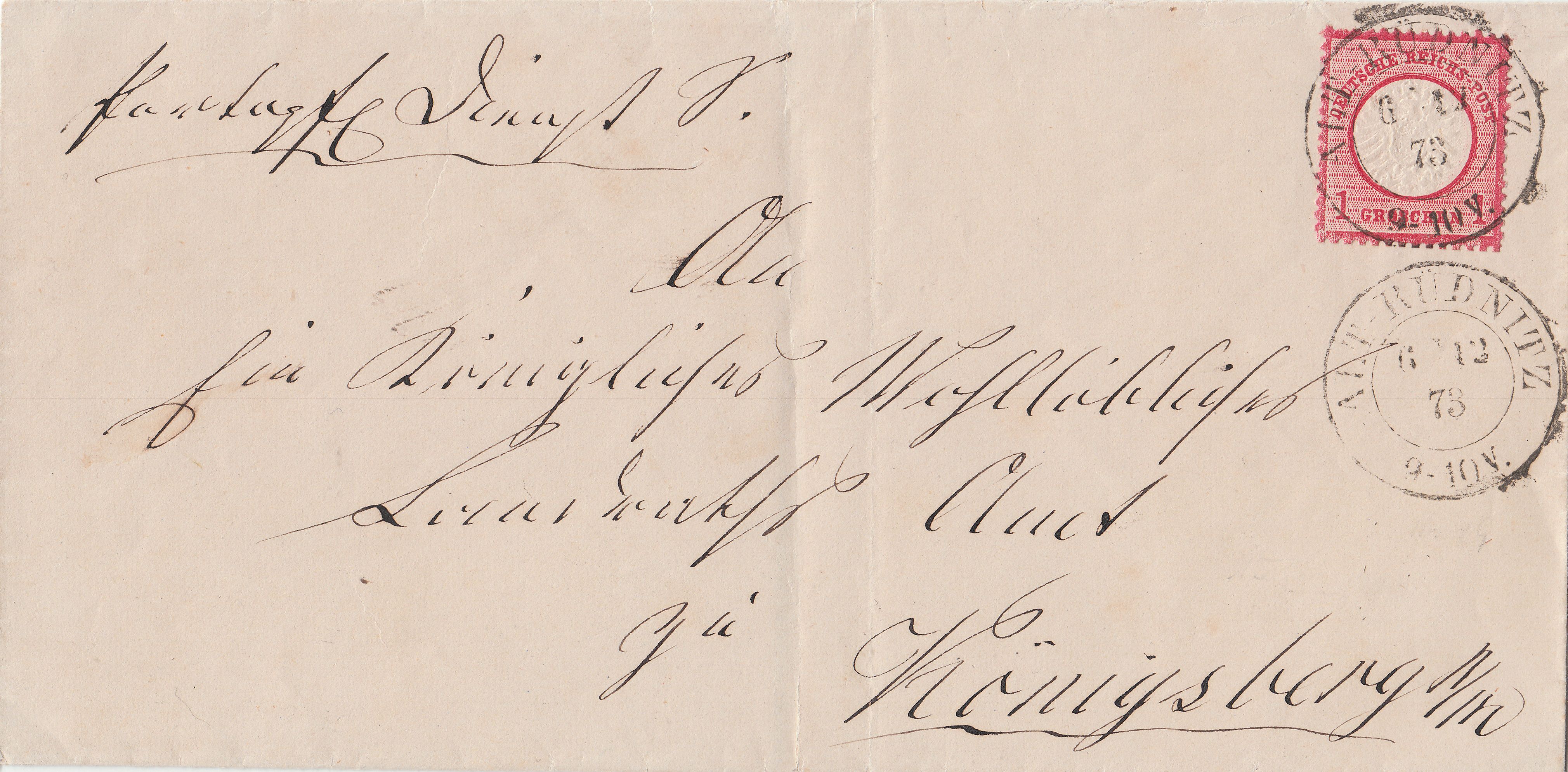 Hier eine EF der MiNr. 19 auf portopflichtiger Dienstsache am 06.12.1873 entwertet per nachverwendetem preussischem Zweikreisstempel "ALT-RÜDNITZ", katalogisiert als Feuser Preußen 073: