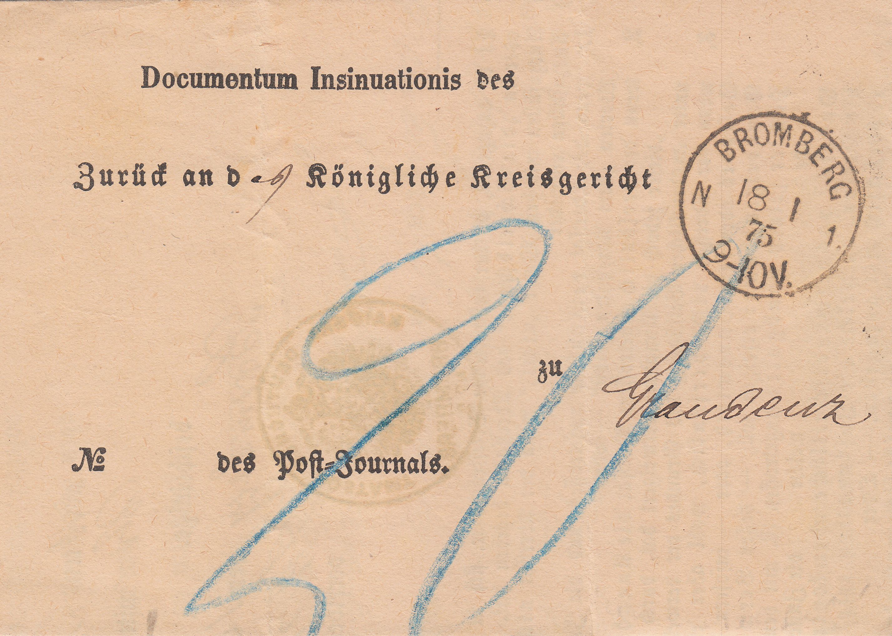Hier ein Insinuationsdokument "Zurück an das Königliche Kreisgericht zu Graudenz", aufgegeben am 18.01.1875 in Bromberg, was ein aptierter ehemaliger Frankostempel "BROMBERG N 1." dokumentiert: