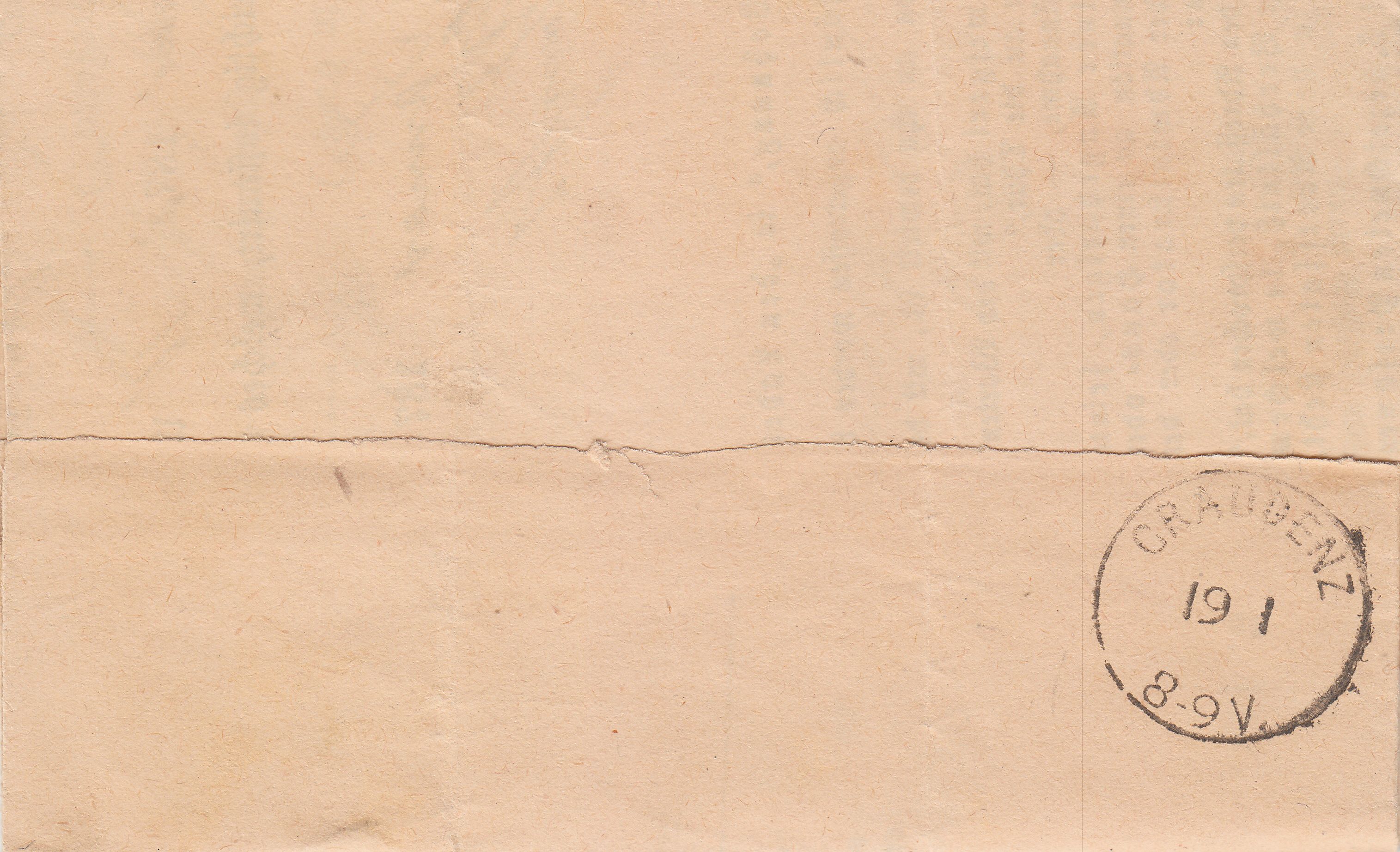 Der Beleg kam am 19.01.1875 in Graudenz an, was ein rückseitig abgeschlagener Ausgabestempel dokumentiert: