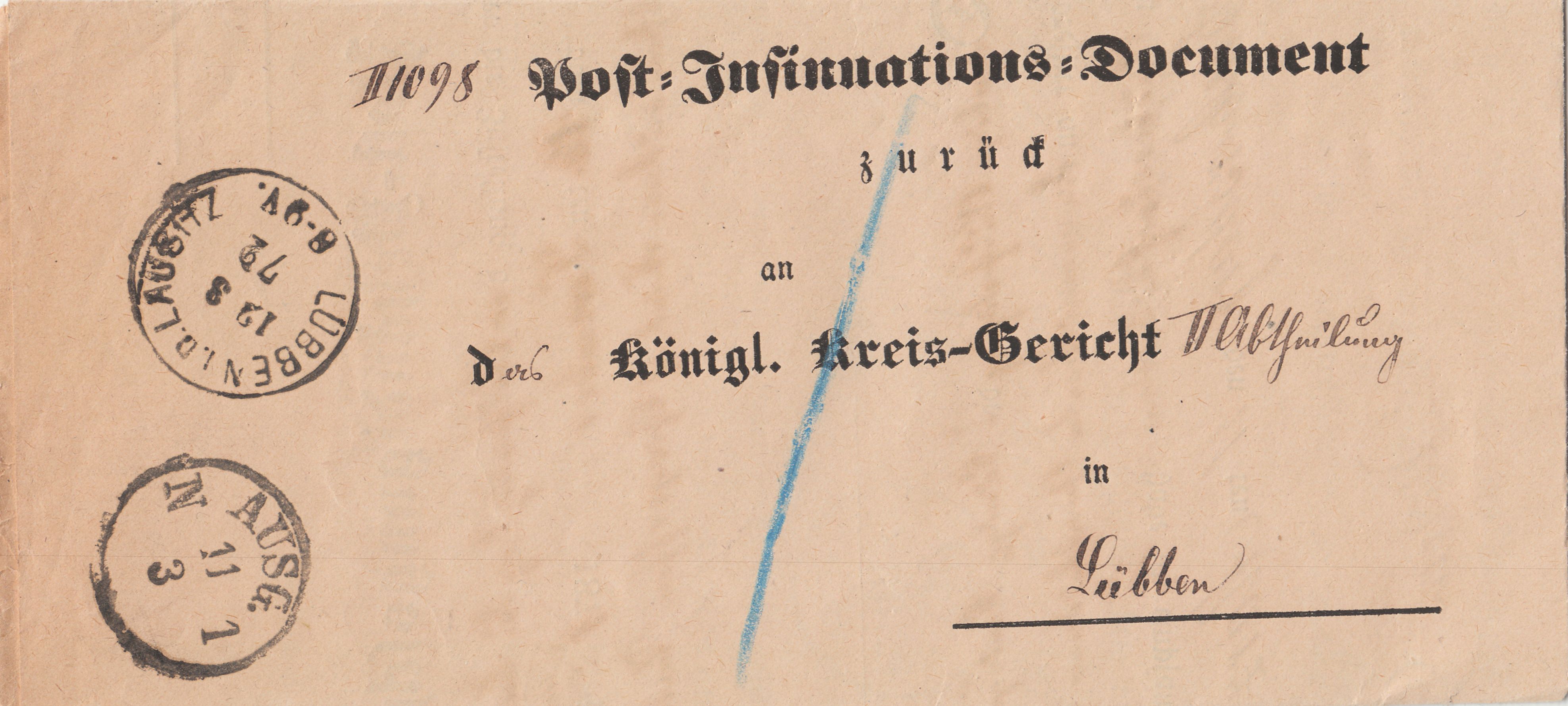 Dieses "Post-Insinuations-Document" lief im März 1872 im Ortsbestellbezirk von Lübben in der Lausitz: