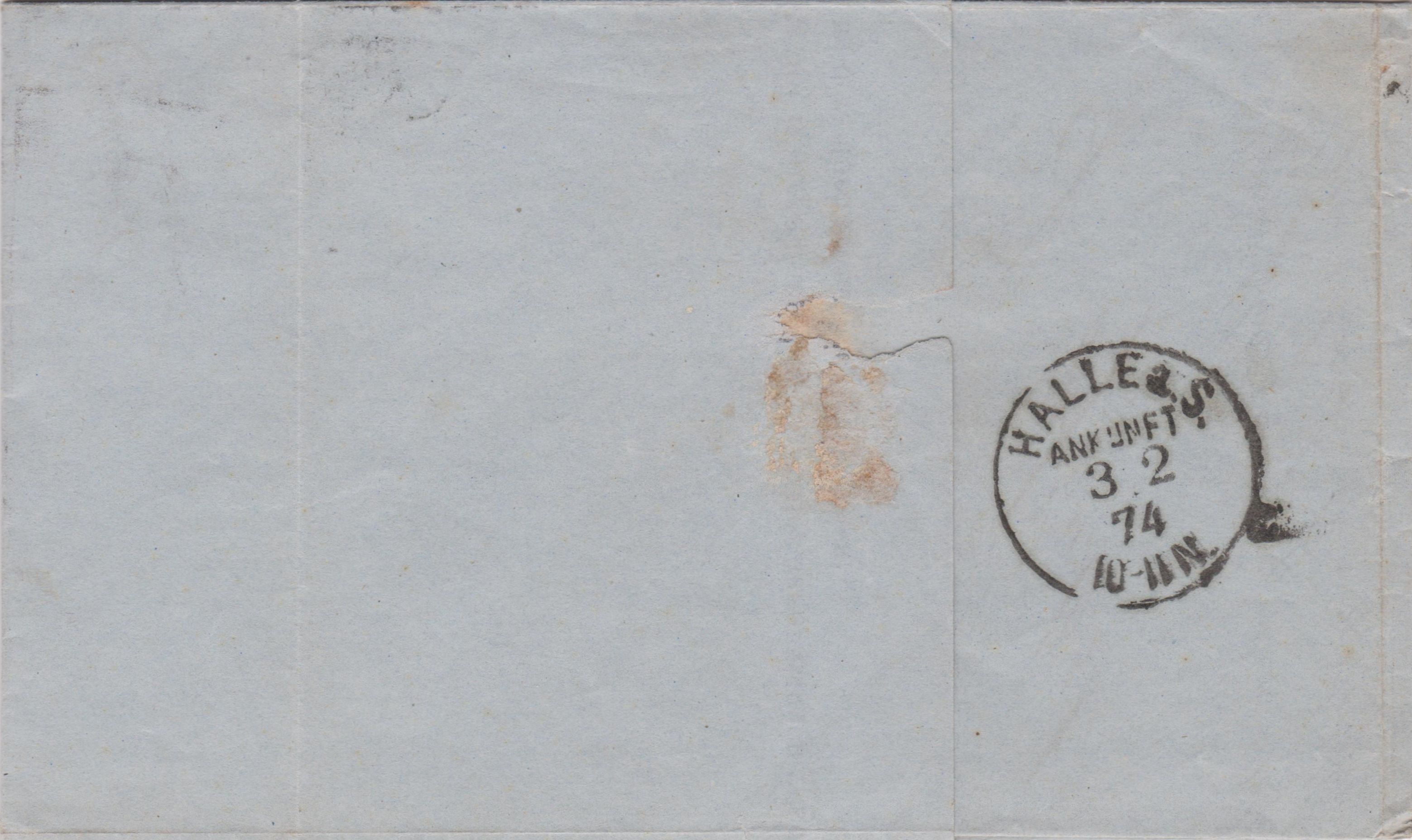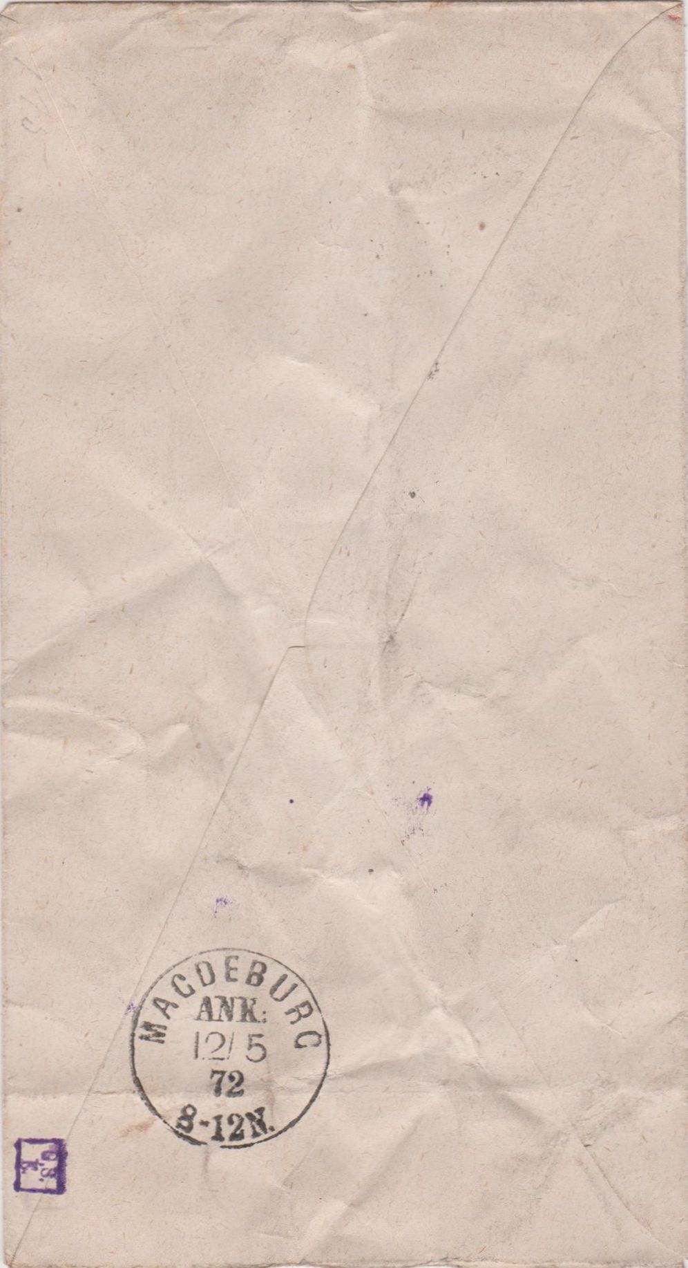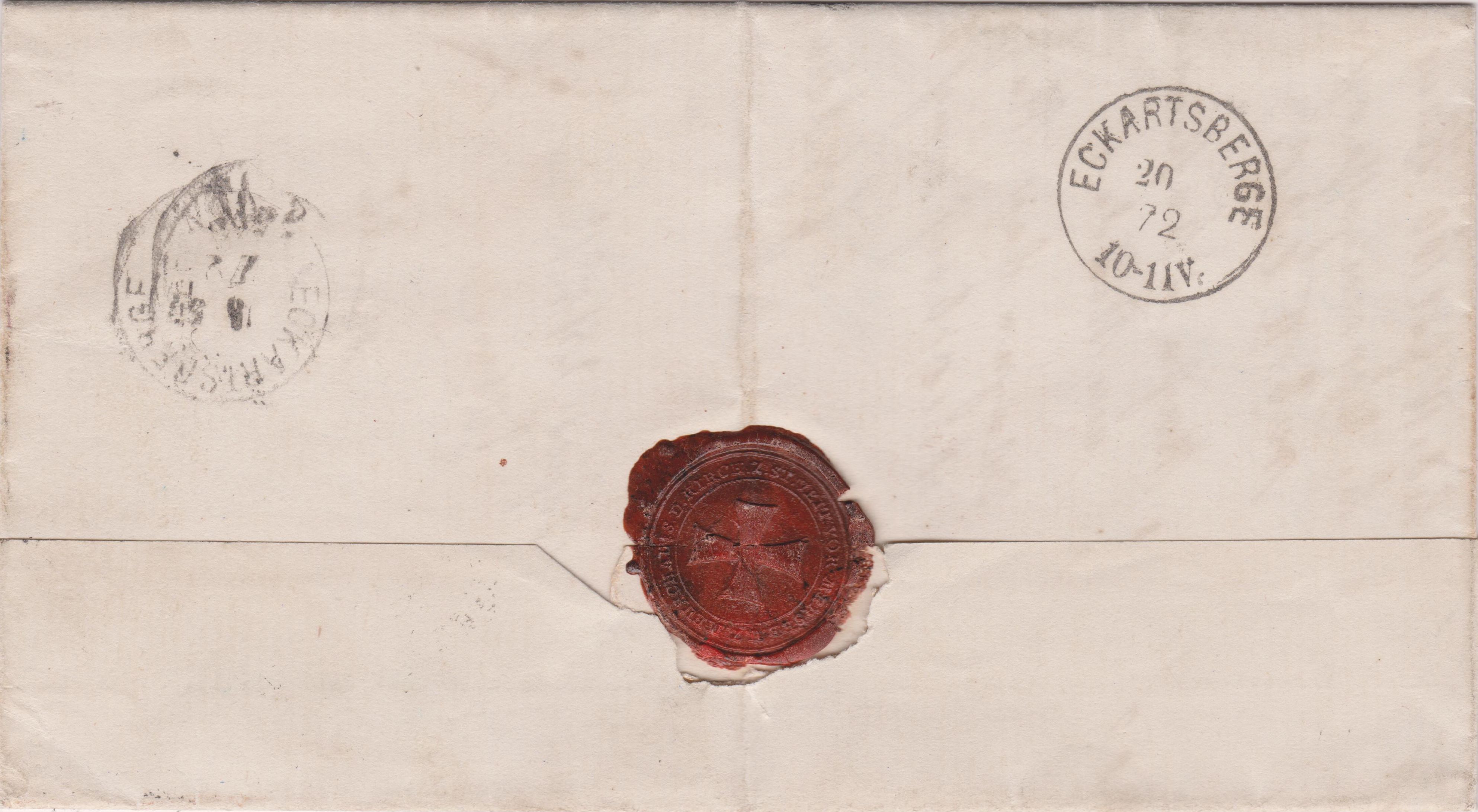 Der Beleg kam am Montag, dem 20.05.1872 beim Bestimmungspostamt "ECKARTSBERGE" an, was ein rückseitig abgeschlagener Tagesstempel "ECKARTSBERGE", Feuser NDP 256, dokumentiert, bei dem die Monatsangabe "5" fehlt: