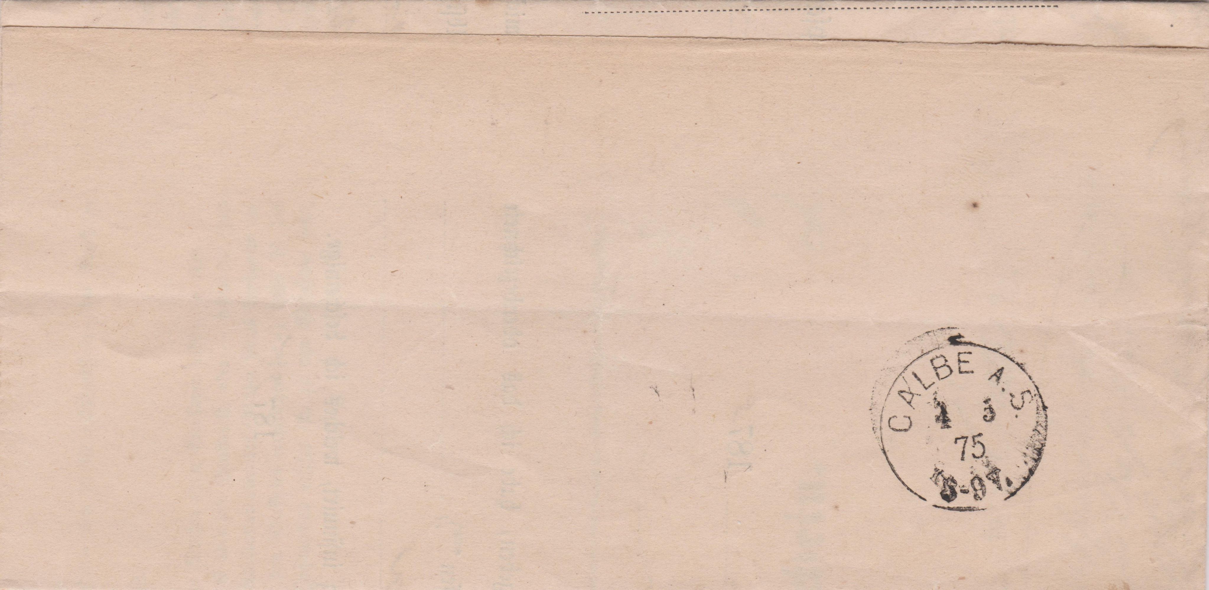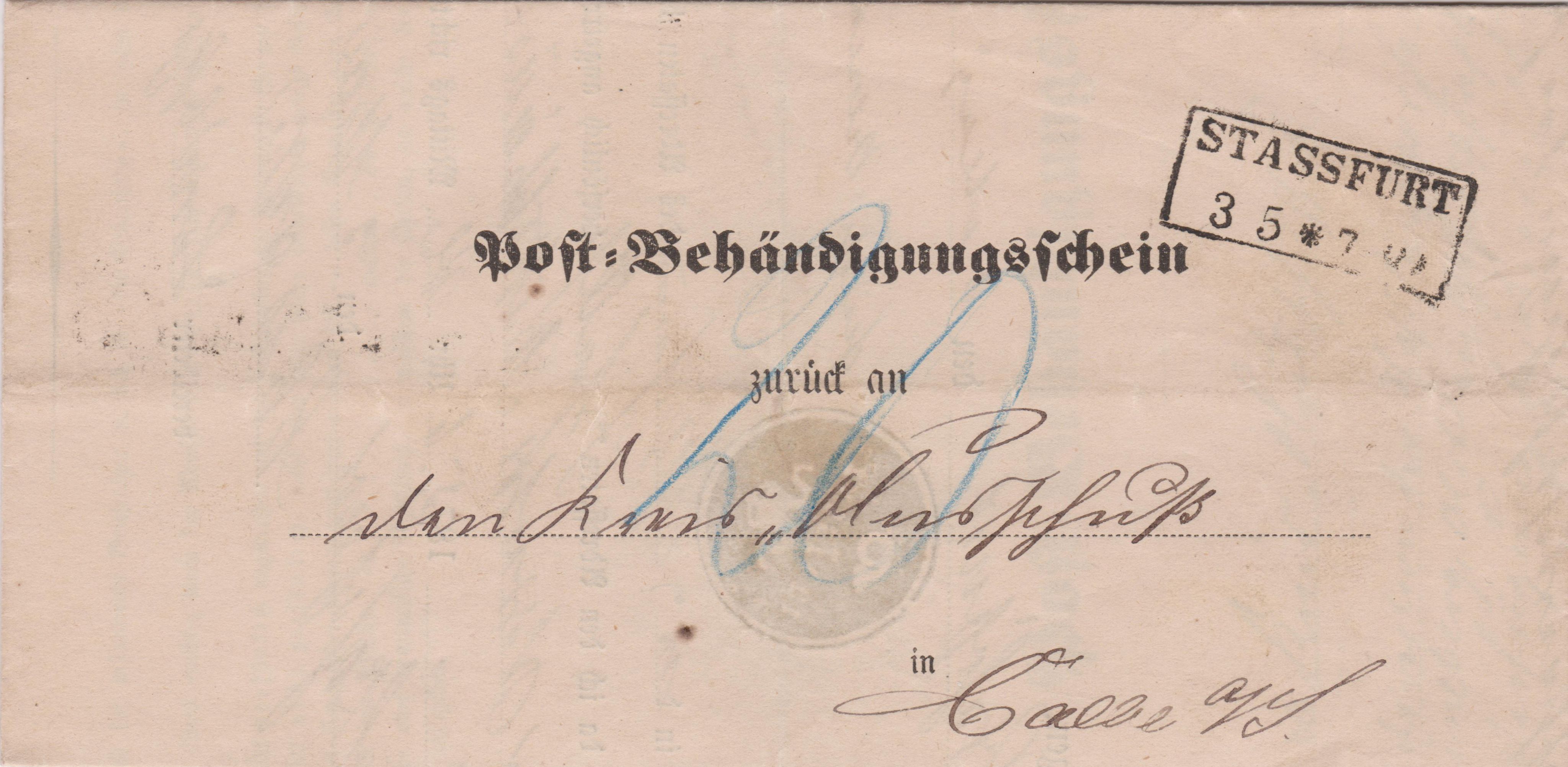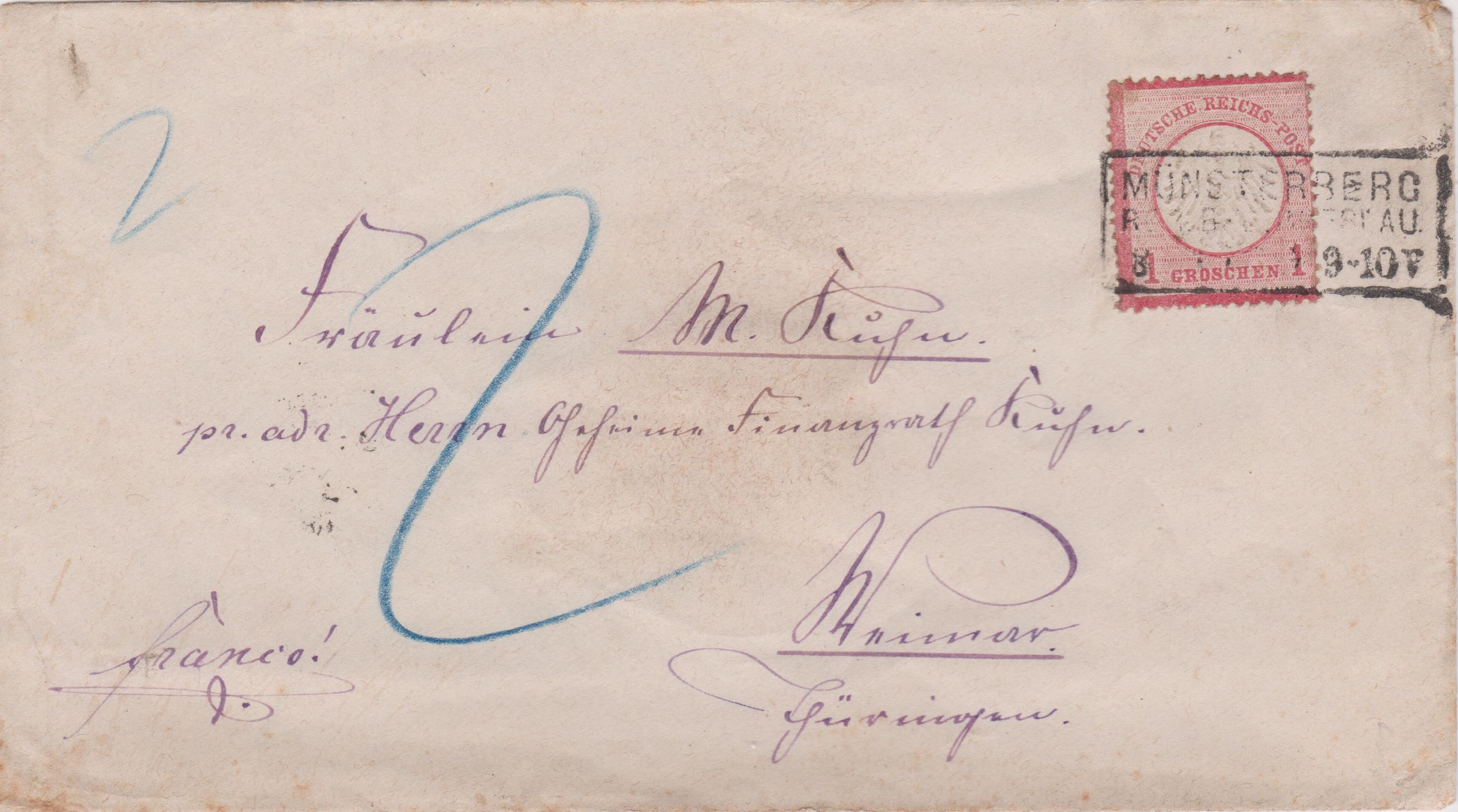 Der Brief erreichte seinen Bestimmungsort Erfurt am 01.01.1874, was ein rückseitiger Ausgabestempel dokumentiert: