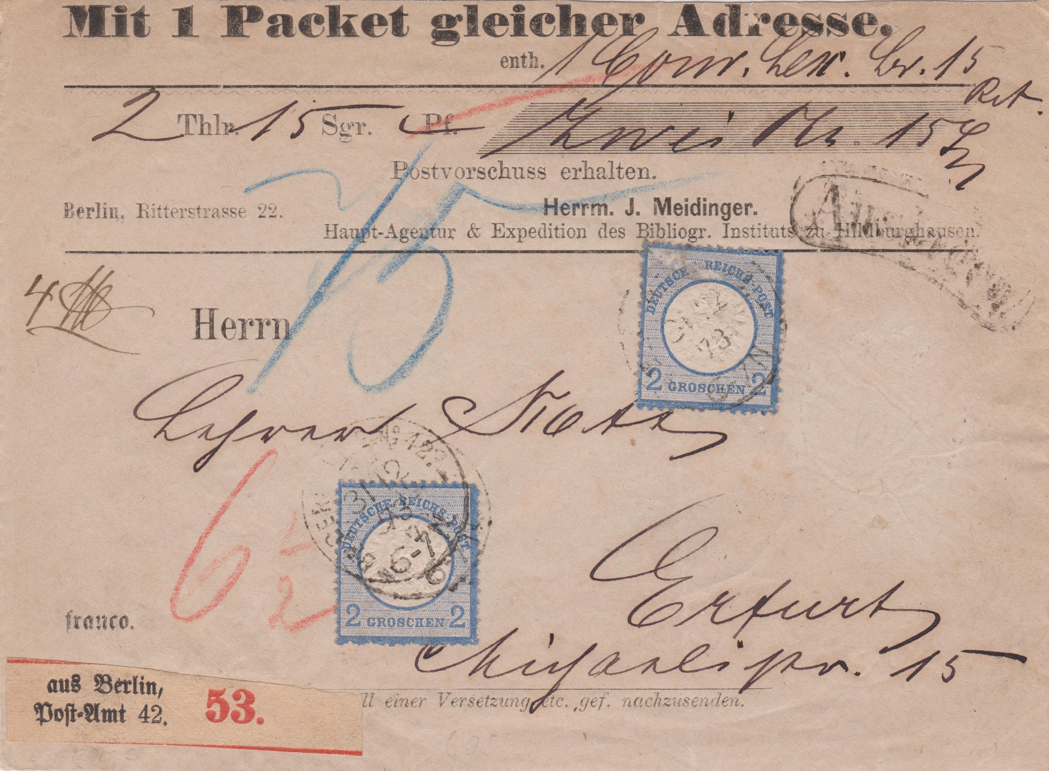 Hier ein Paketbegleitbrief "Mit 1 Packet gleicher Adresse.", adressiert nach "Erfurt", aufgegeben am 31.12.1873 in Berlin: