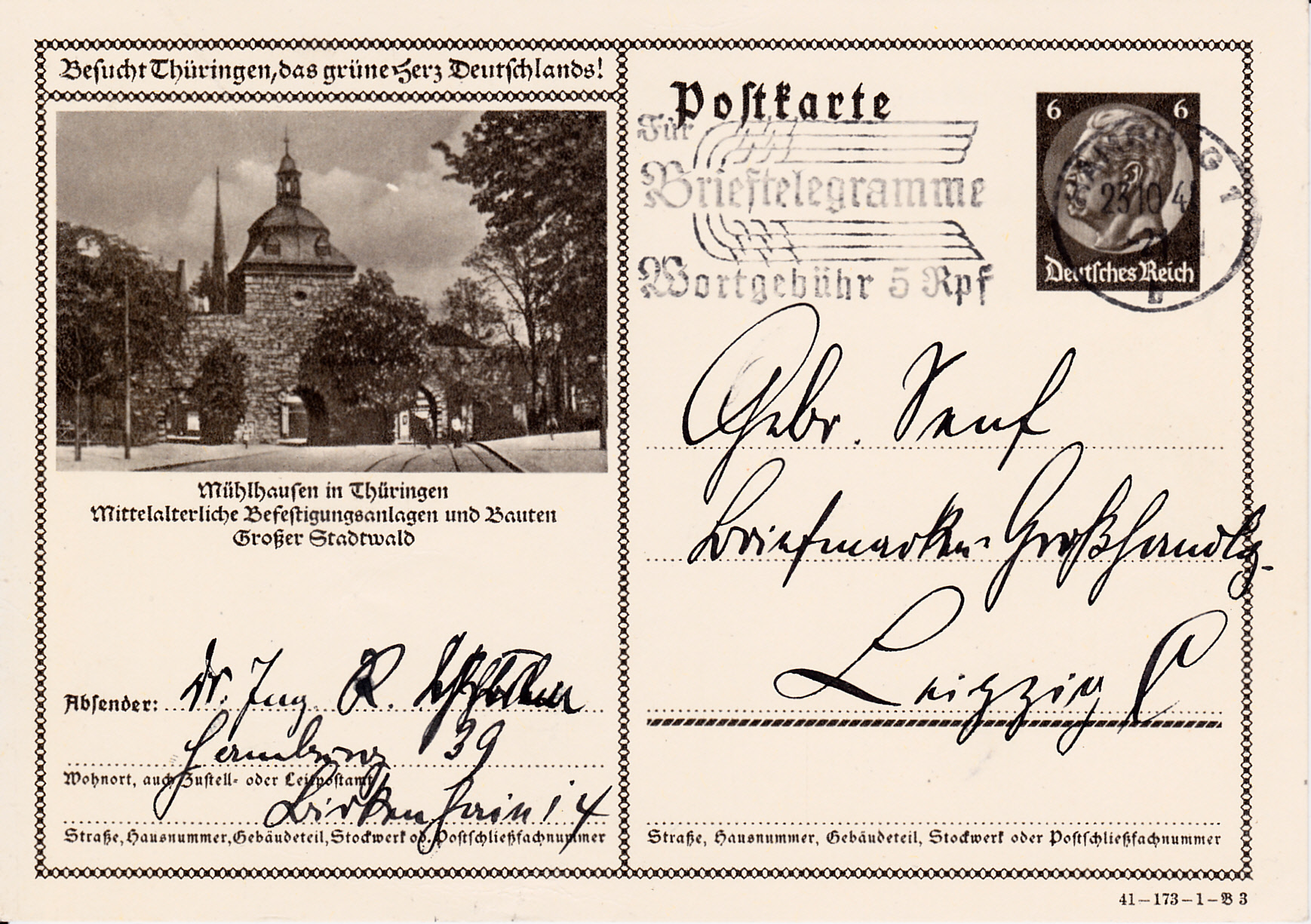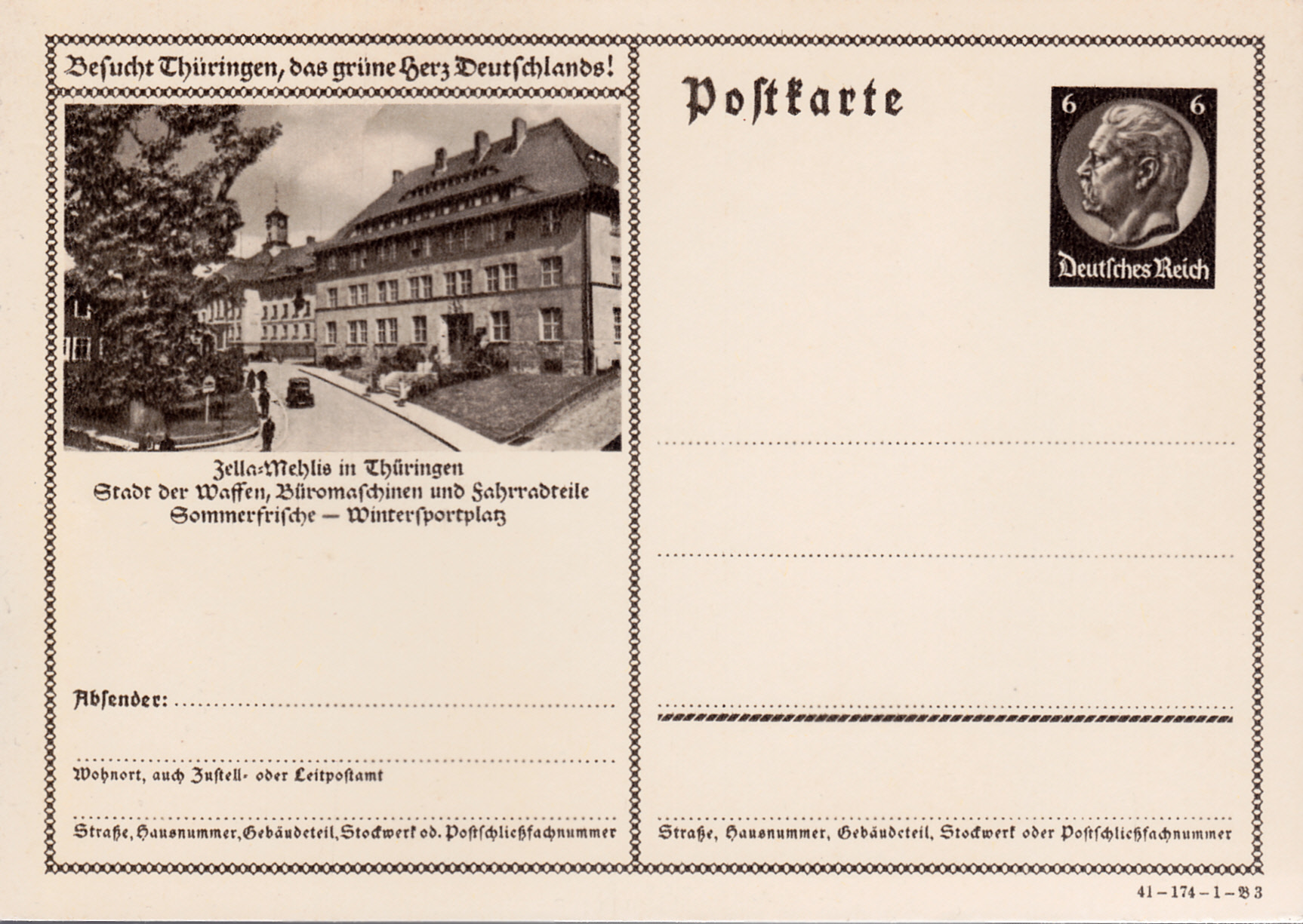 Diese Bildpostkarte 1941 (Serie 173 Bild 4) für Tabarz (Thüringer Wald) unterscheidet sich von einer Vorjahrskarte auch wieder nur im Druckvermerk.