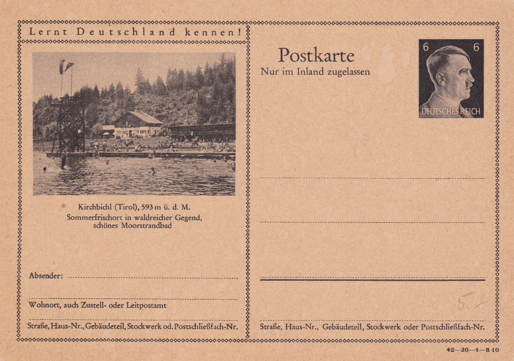 Kirchbichl (Tirol) wirbt mit dieser Karte (Serie 20 Bild 10) und einem Bild mit seinem Strandbad als Sommerfrischeort. Kirchbichl gehört heute wieder zu Österreich.