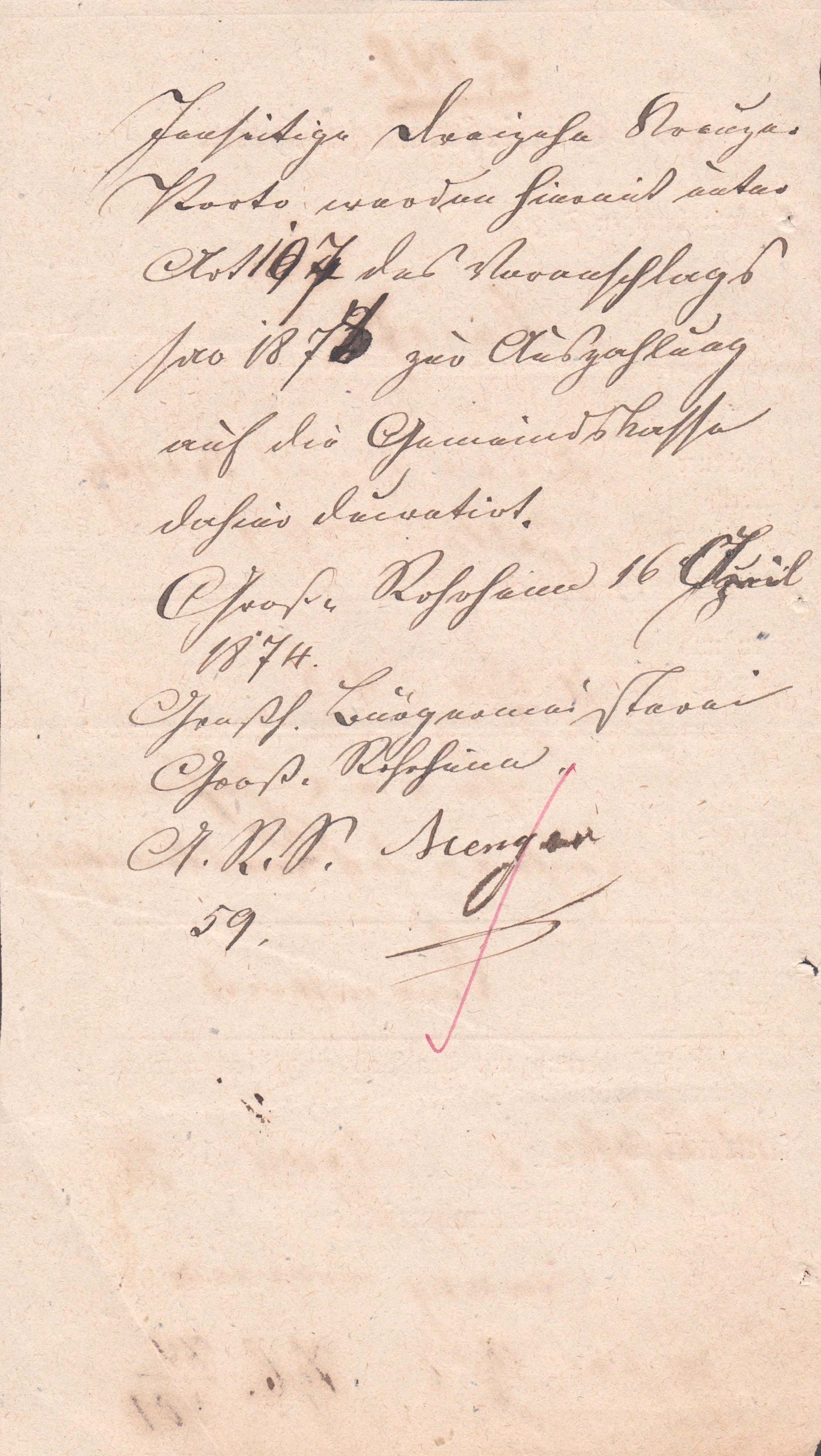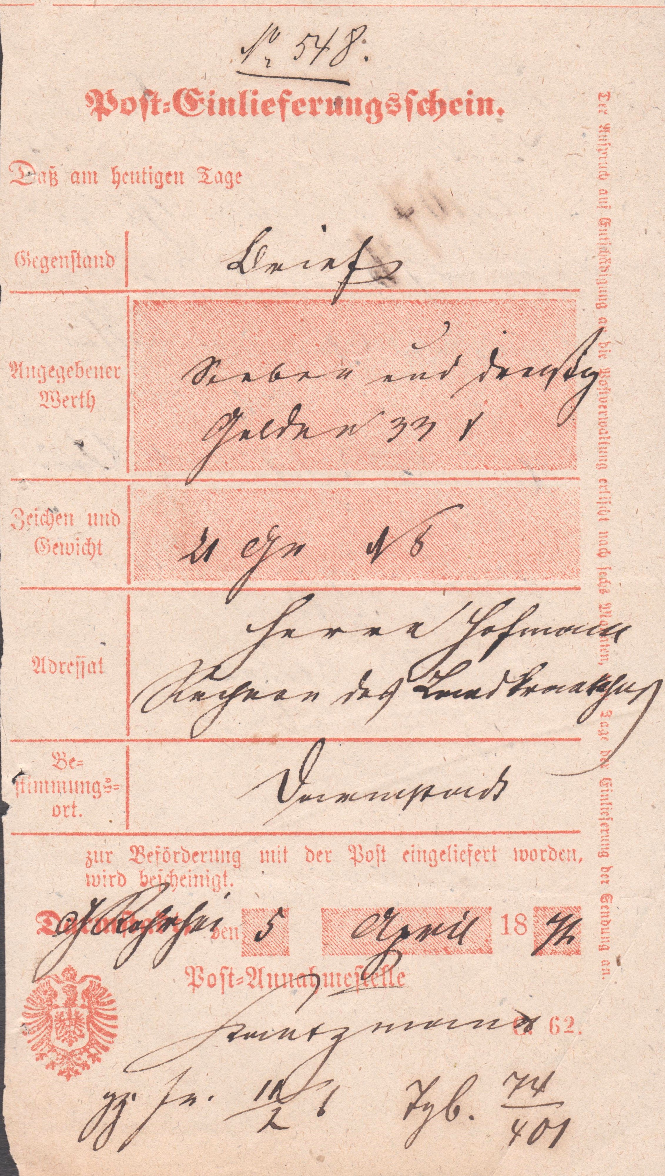 Post-Einlieferungsschein vom 05.04.1874 aus Darmstadt: