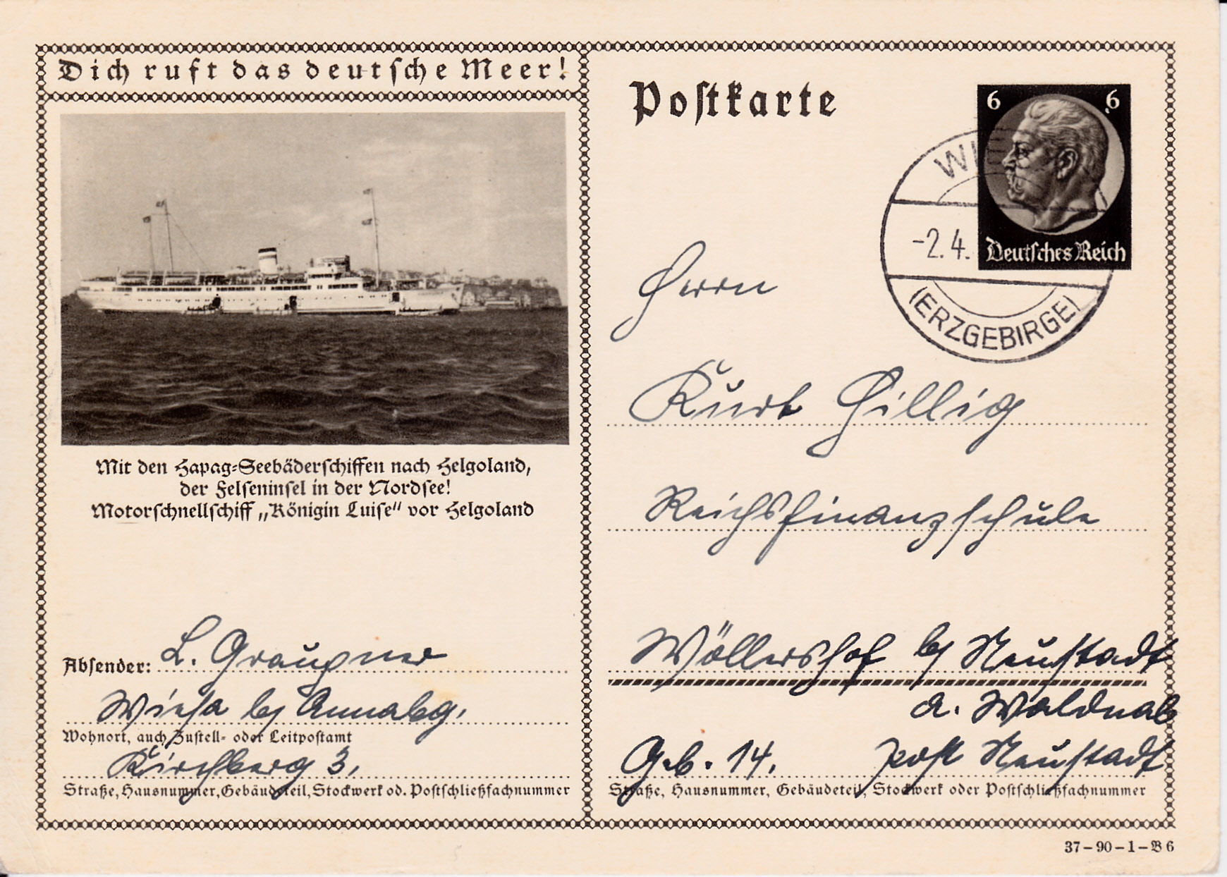 Auf der nächsten Karte (Serie 90 Bild 5) ist das Seebäderschiff "Königin Luise" vor der Insel Helgoland gezeigt. Vom 1.6.1934 bis ins Jahr 1939 war es im Ausflugsverkehr nach Helgoland eingesetzt.