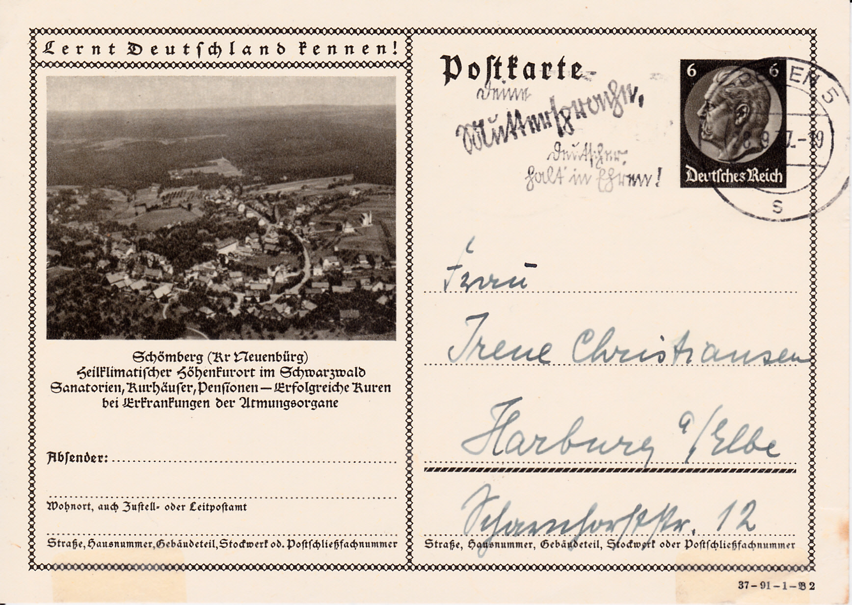 Die Karte von Schömberg gibt es auch mit einem anderen Druckvermerk (Serie 91 Bild 2).