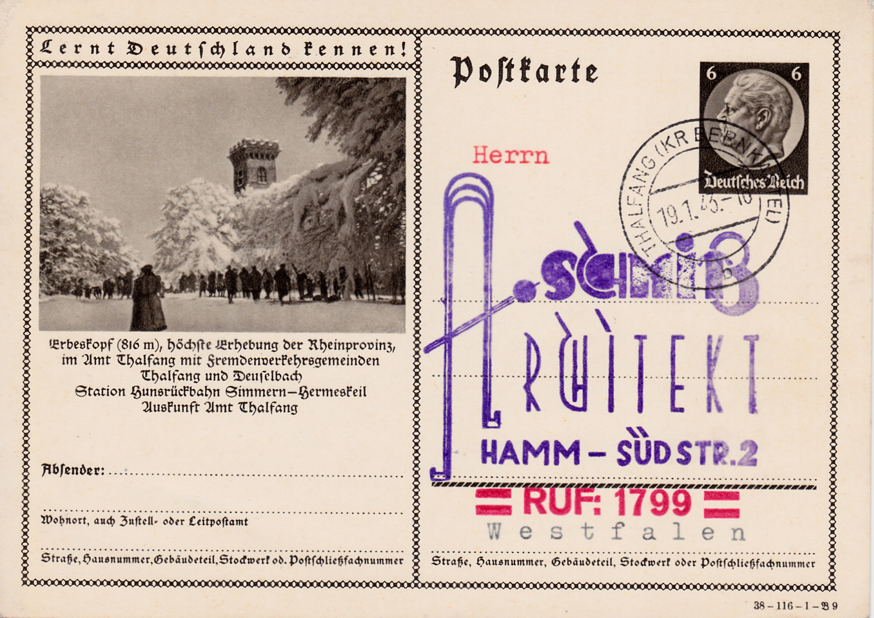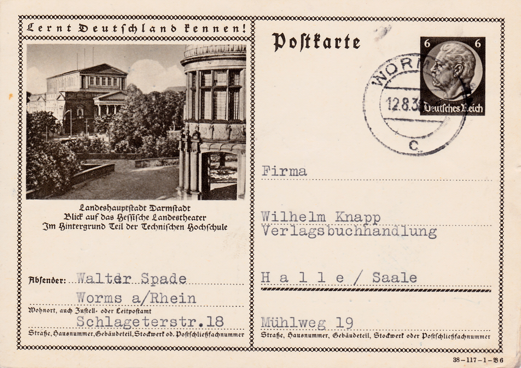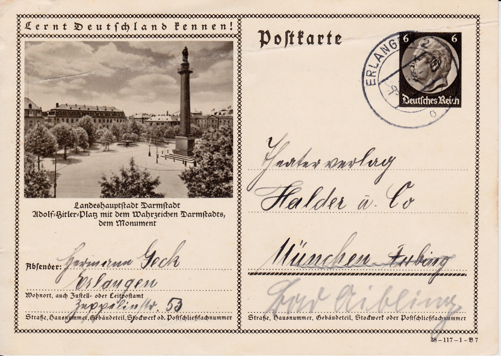 Darmstadt zeigt auf dieser Karte (Serie 117 Bild 7) das Ludwigsmonument (umgangssprachlich "Langer Lui" oder "Langer Ludwig"). Dieses ist ein Denkmal für Ludewig I., den ersten Großherzog von Hessen und bei Rhein, und ein Wahrzeichen der Stadt Darmstadt. Es steht auf dem heutigen Luisenplatz in Darmstadt, der nach Großherzogin Luise von Hessen-Darmstadt, der Ehefrau Ludewigs I. benannt ist. Das Denkmal wurde bereits auf einer anderen Karte 1936 gezeigt.