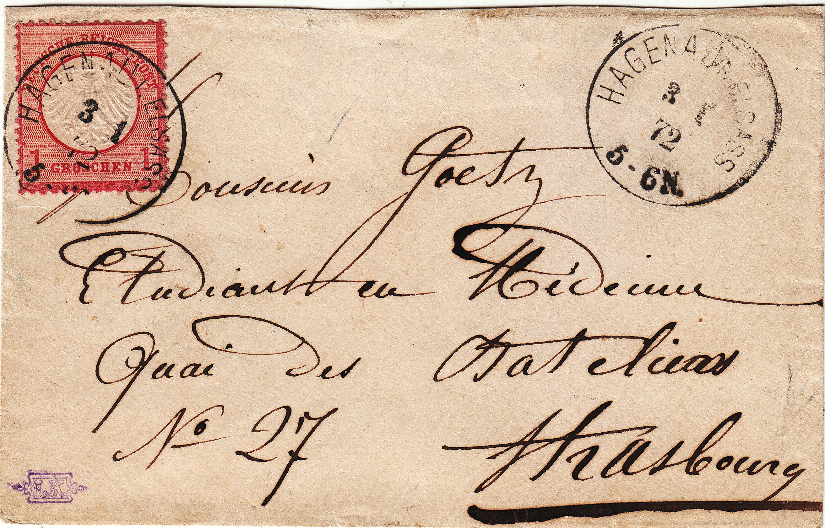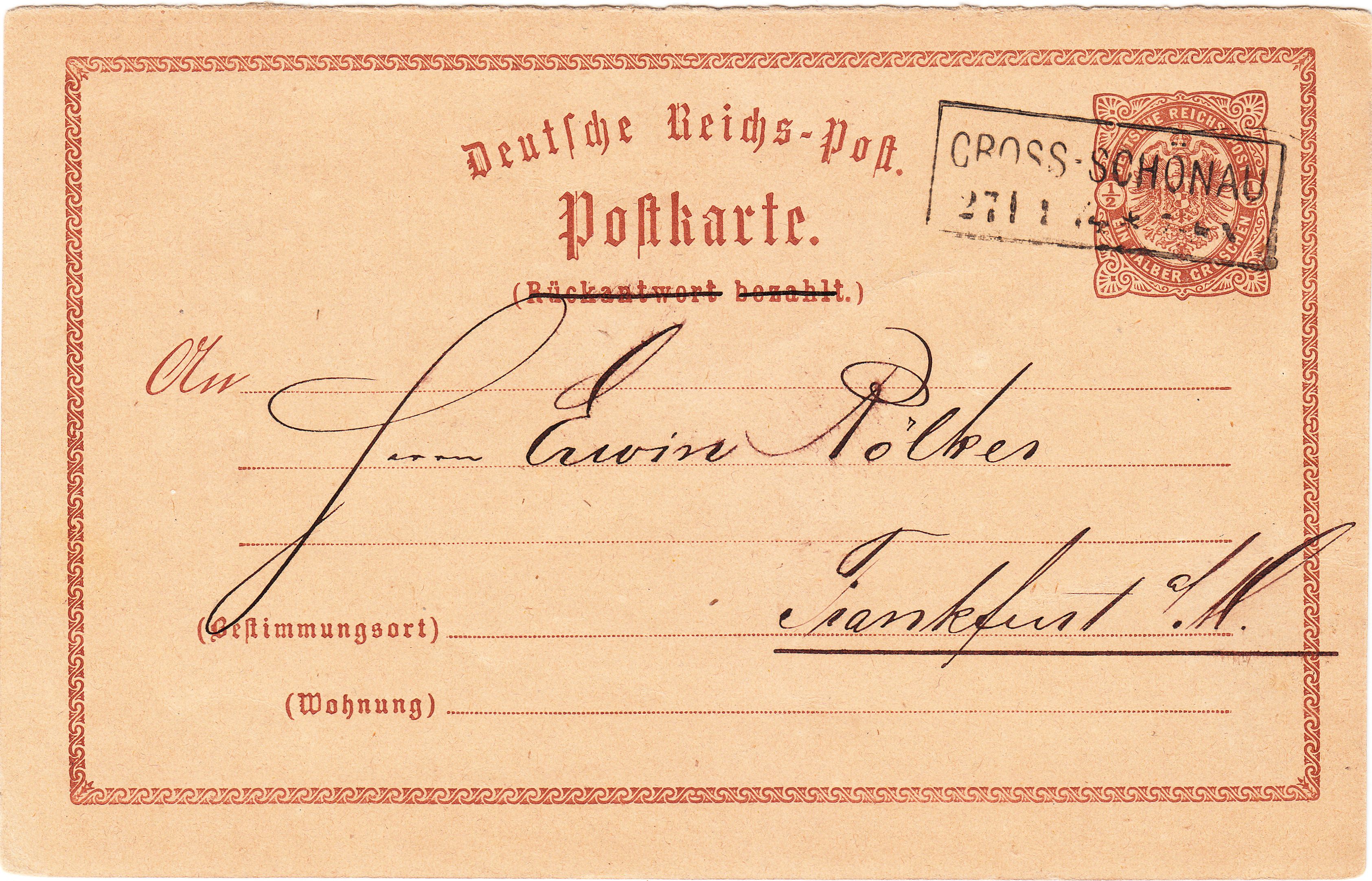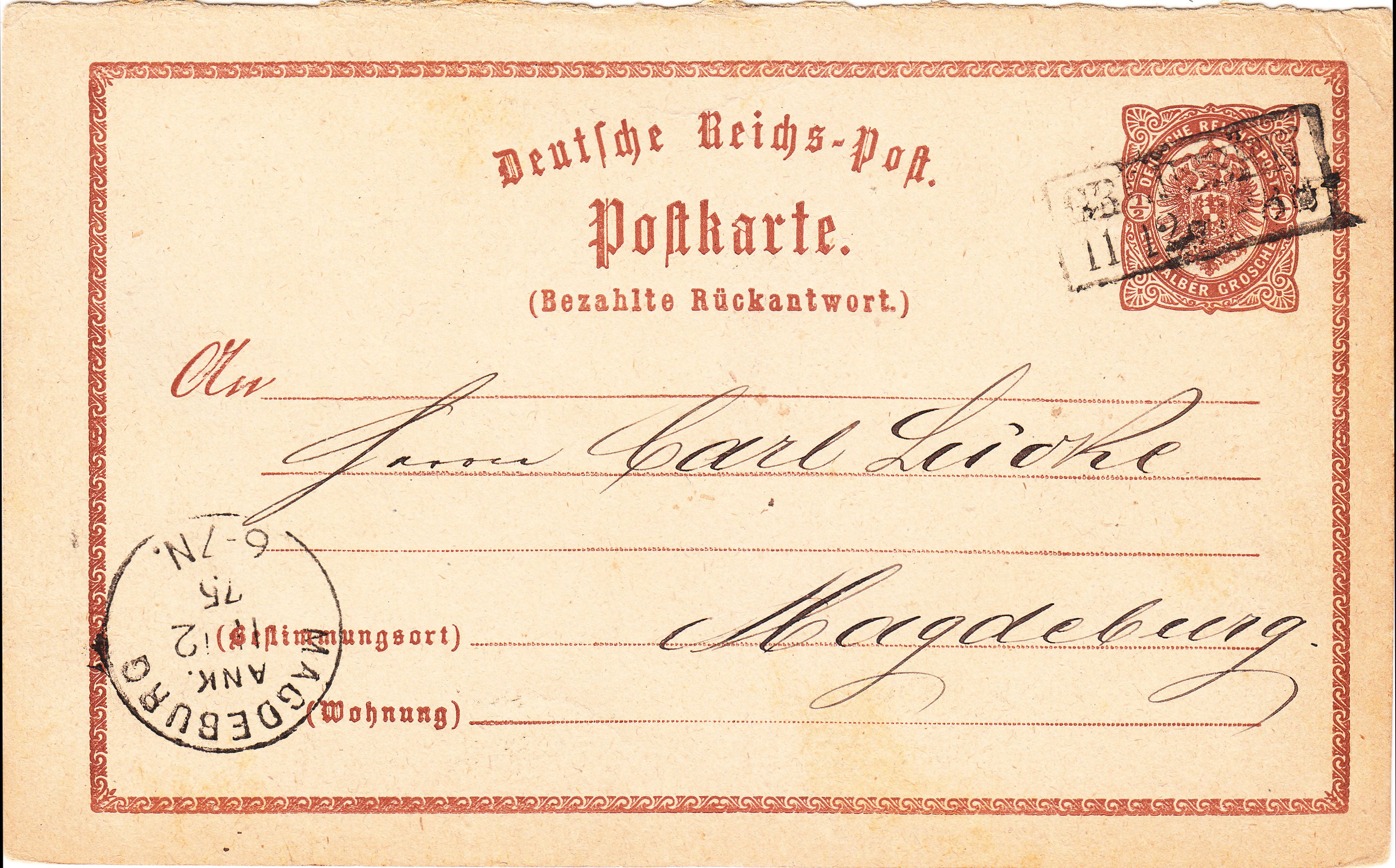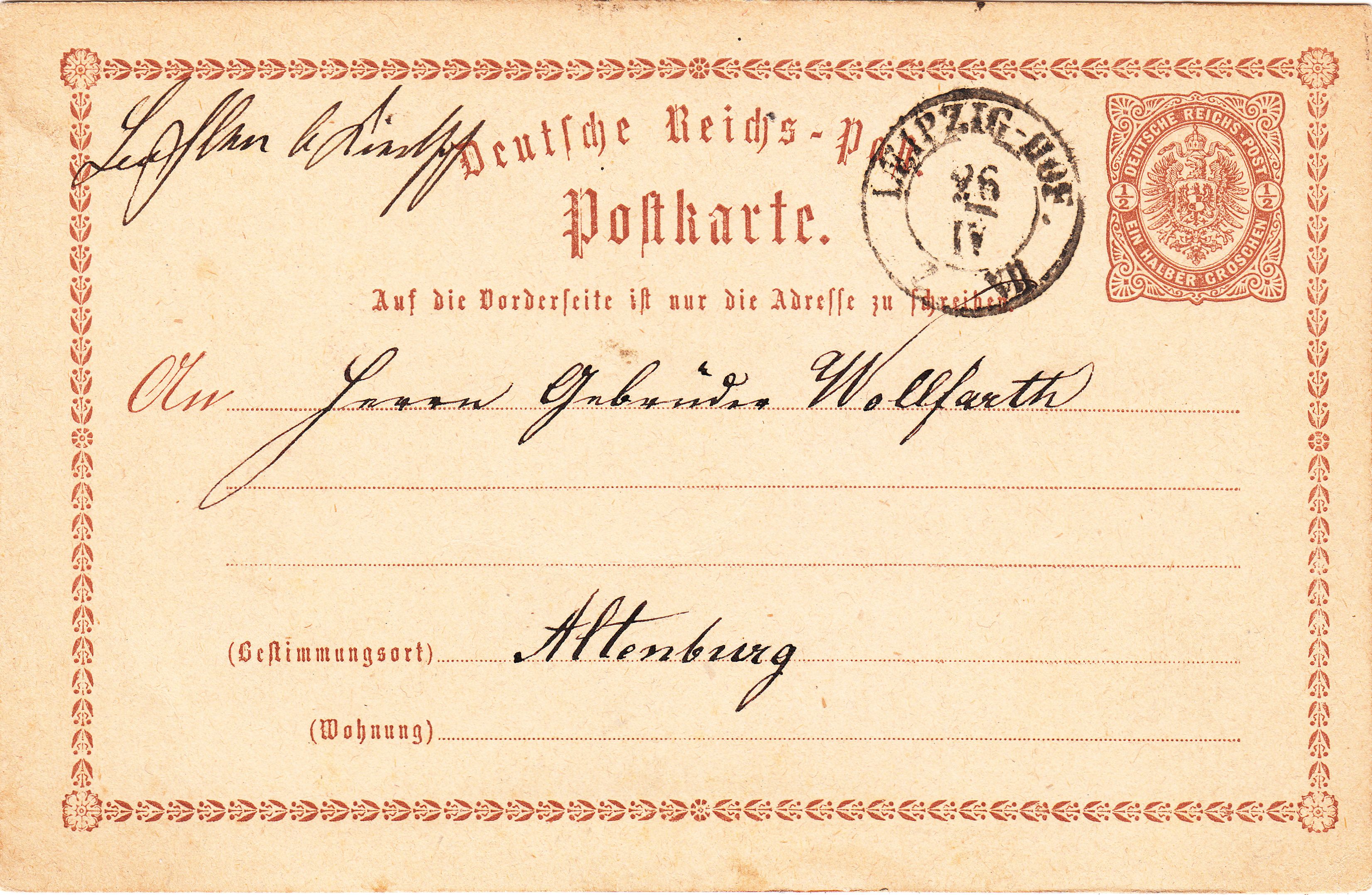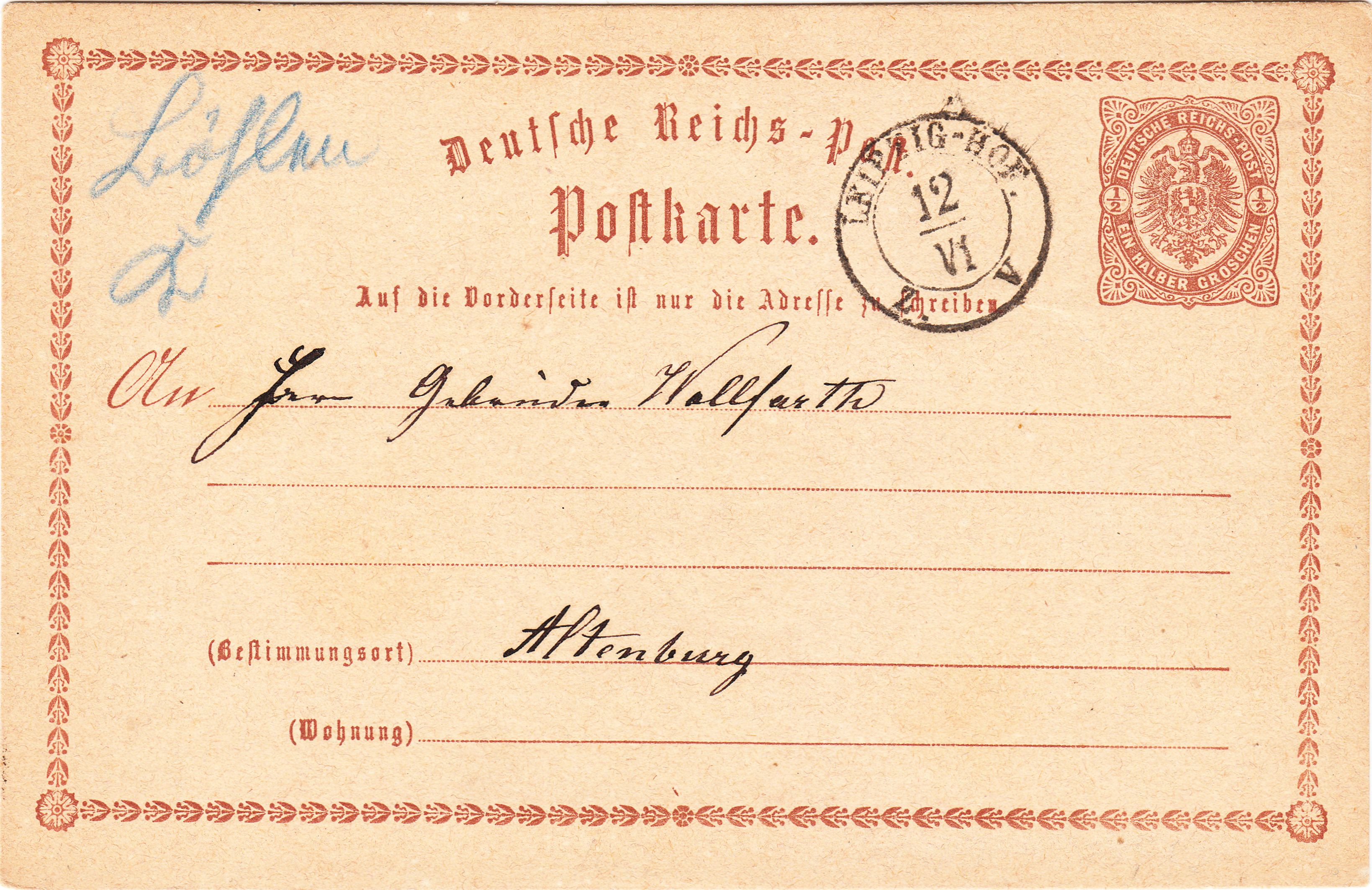 Diese Ganzsache MiNr. P 1 wurde am 12.06.1874 in "Böhlen" dem fahrenden Postamt Nrr. 1 (Leipzig-Hof) zur Beförderung nach Altenburg übergeben und per sächsischem Zweikreisstempel "LEIPZIG-HOF Z V" entwertet: