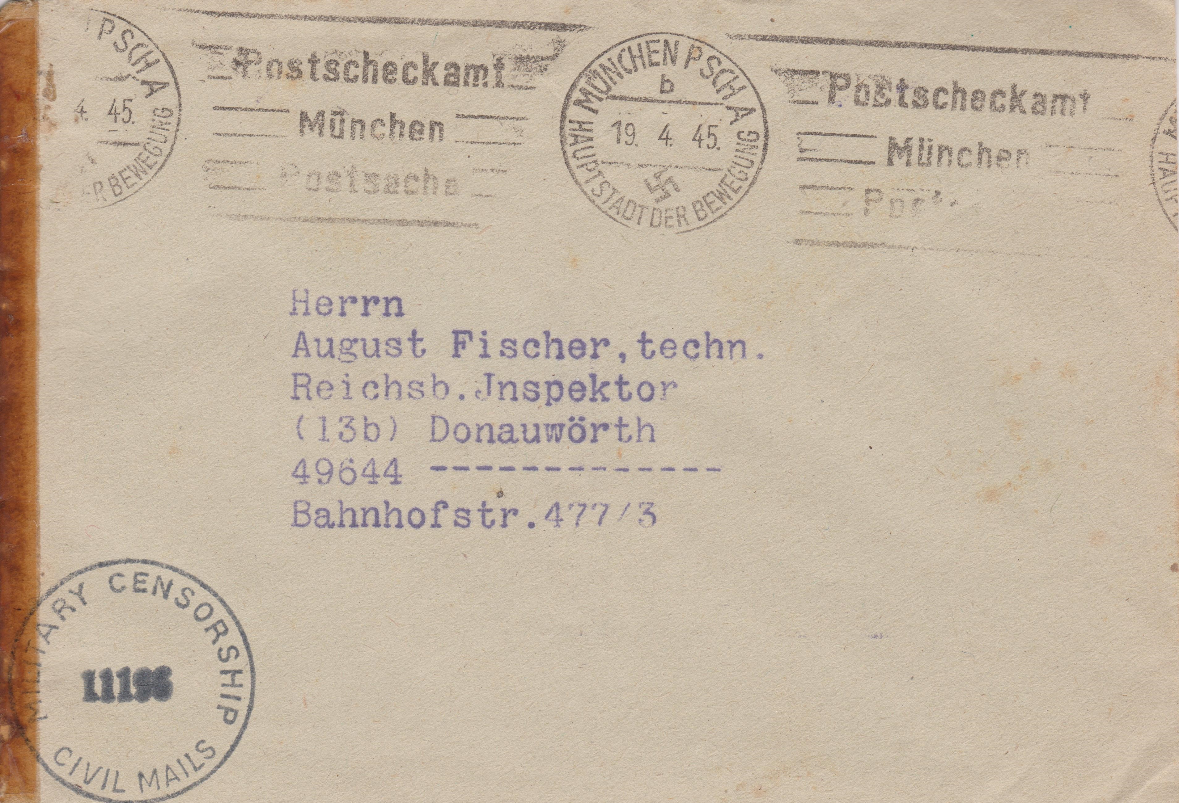 Maschinenstempel "MÜNCHEN PSCHA b HAUPTSTADT DER BEWEGUNG Postscheckamt München Postsache" vom 19.04.1945 auf portofreier Postsache nach Donauwörth: