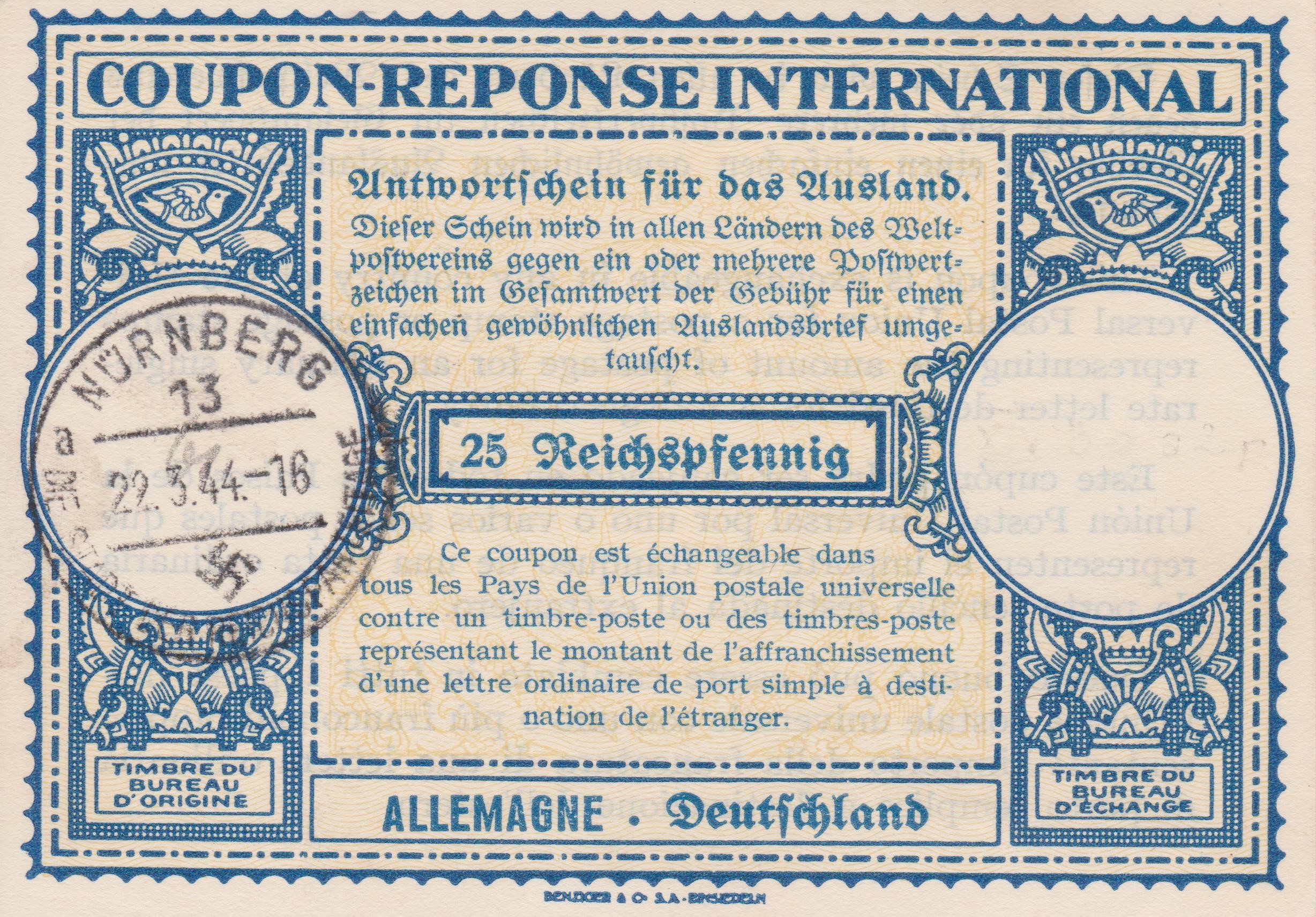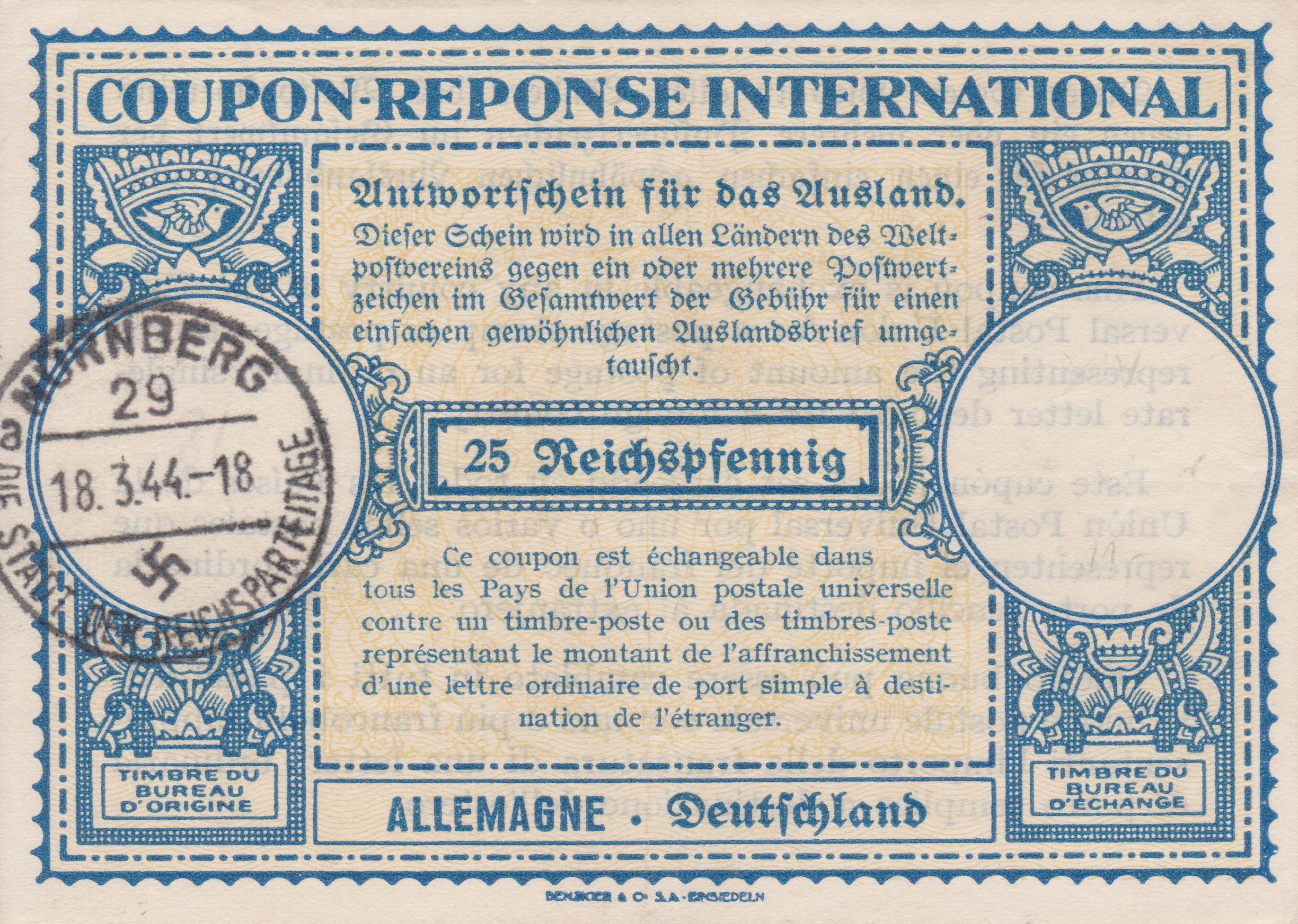 Dieser "Antwortschein für das Ausland" kostete "25 Reichspfennig" und wurde am 22.03.1944 um 16 Uhr im Postamt NÜRNBERG 13 gekauft, was der links abgeschlagene Tagesstempel dokumentiert. Der Tagesstempel mit dem Kennbuchstaben "a" enthält ein Hakenkreuz sowie den Stadt-Ehrentitel "DIE STADT DER REICHSPARTEITAGE":