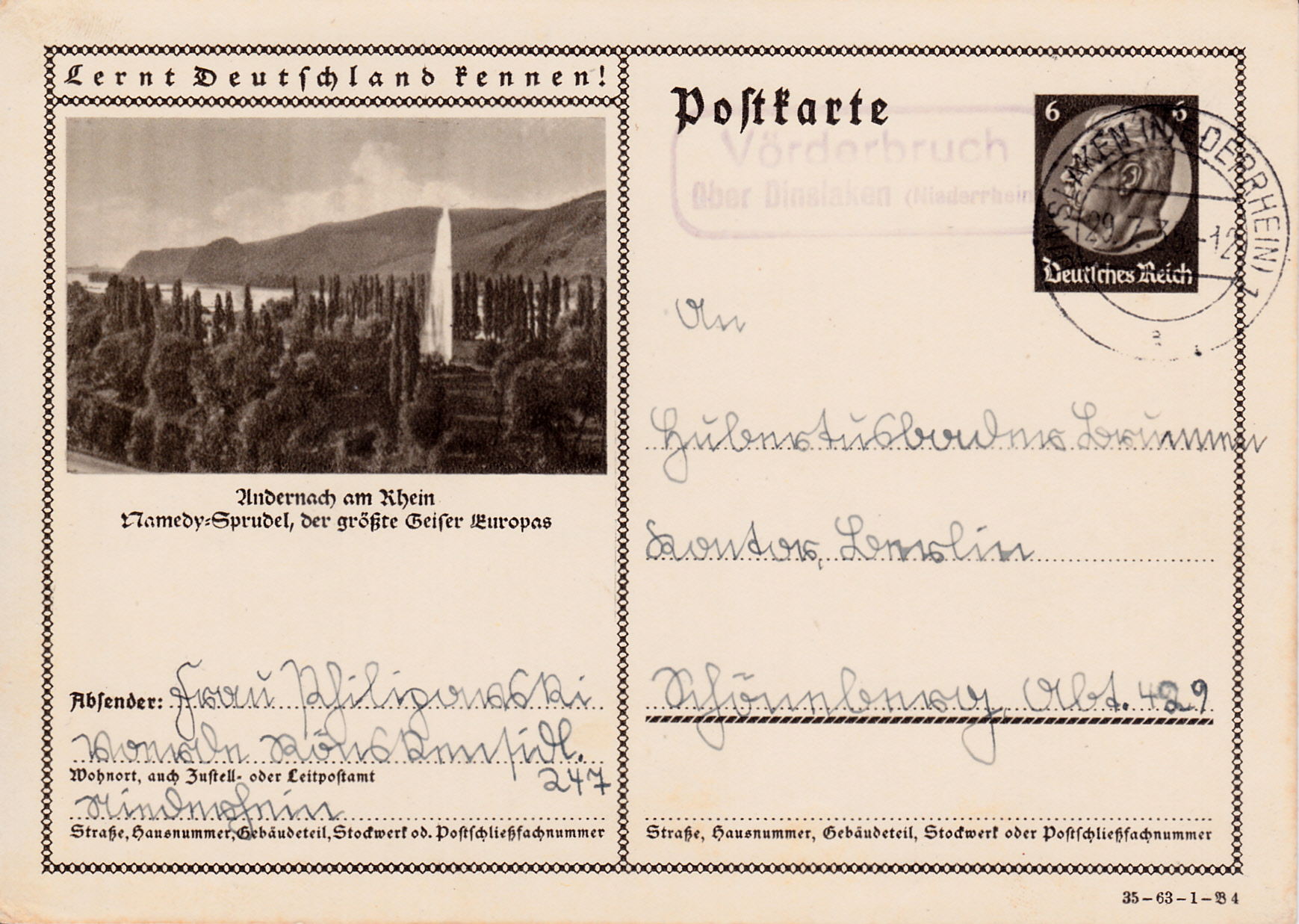 Andernach am Rhein zeigt auf dieser Karte (Serie 63 Bild 4) den Namedyer Sprudel auf dem Namedyer Werth (Krummenwerth), der mit etwa 55–60 Metern der höchste Kaltwassergeysir der Welt ist.
