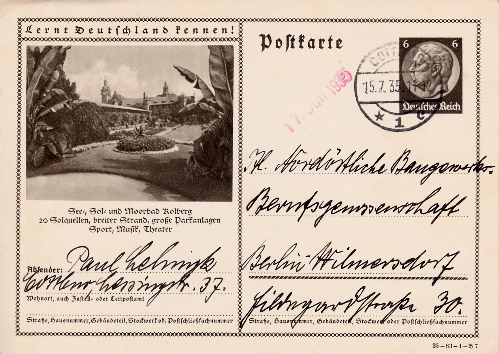 Auf dem Foto dieser Karte (Serie 63 Bild 2) wird das Strandschloss (Kurhaus) mit Seesteg in Kolberg gezeigt. Kolberg heißt heute Kołobrzeg und ist eine Hafenstadt in der polnischen Woiwodschaft Westpommern. Kołobrzeg ist ein Sol- und Kurbad an der Ostsee.