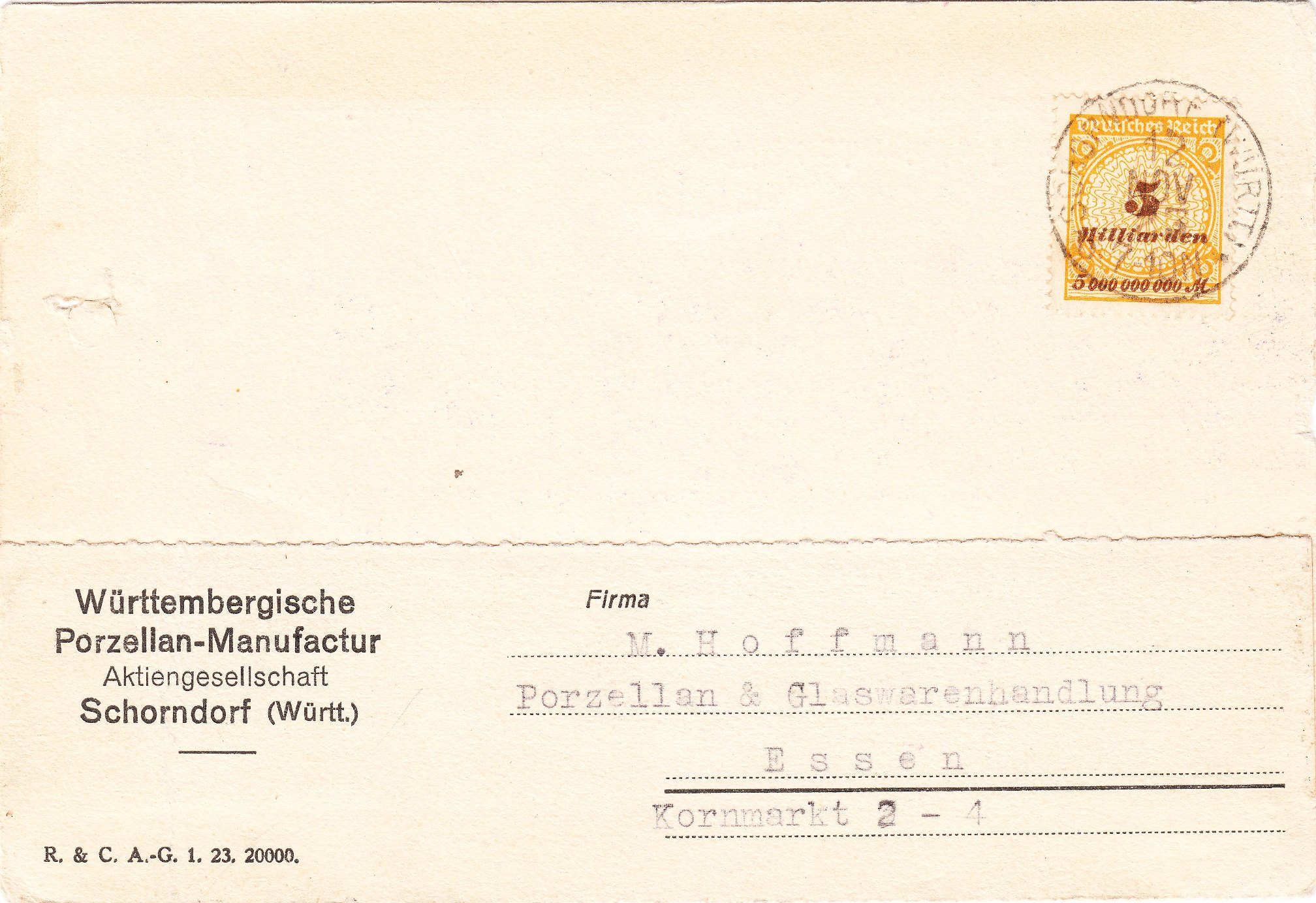 Vom 12.11.1923 bis zum 19.11.1923, also ganze 8 Tage lang, galt für einen Brief im Fernverkehr die hier als Mehrfachfrankatur mit einem Paar der MiNr. 327 A P dargestellte Portostufe von 10 Milliarden Mark: