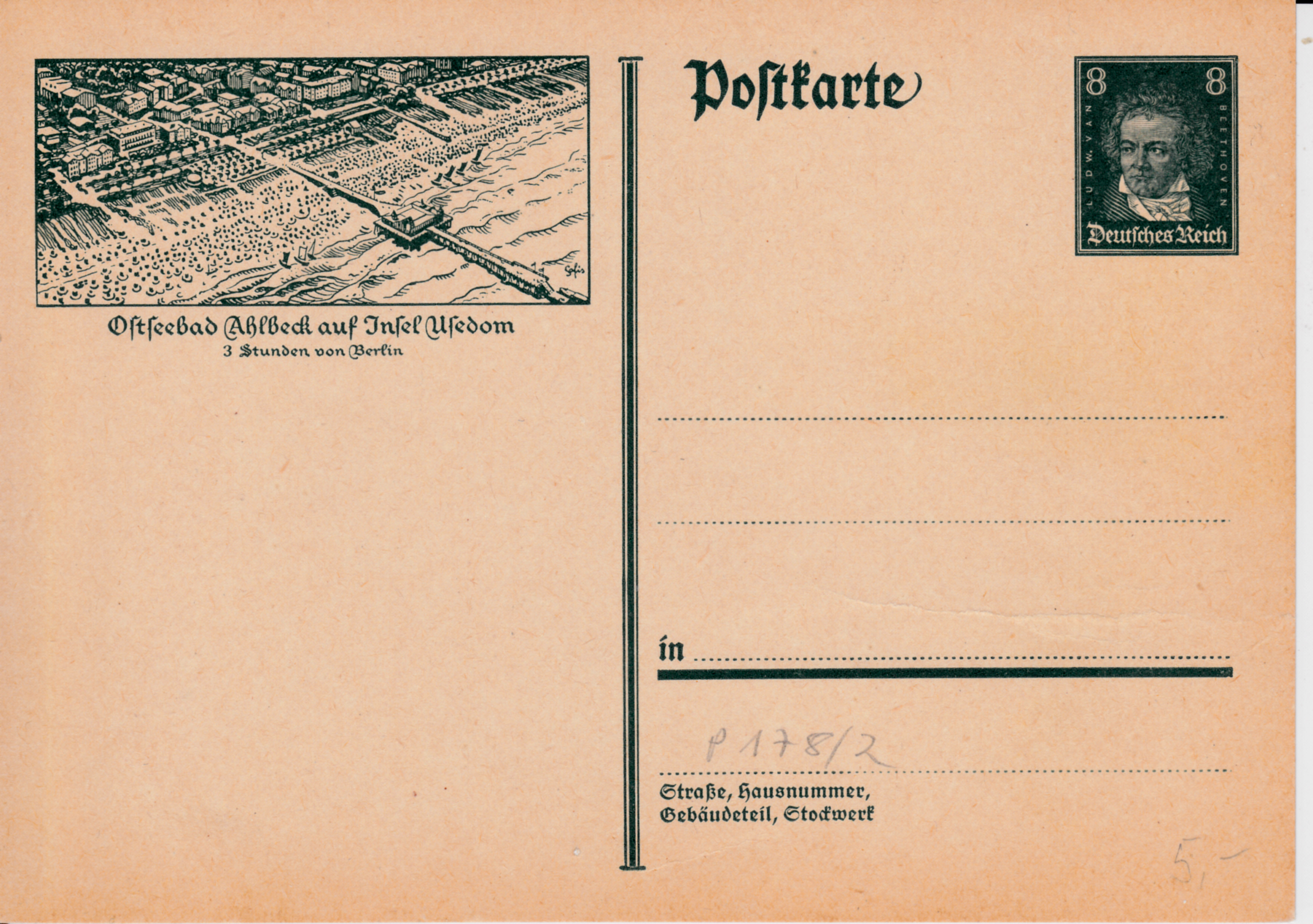 Auf der Bildpostkarte MiNr P 178/02 wird für das Ostseebad Ahlbeck auf der Insel Usedom geworben.