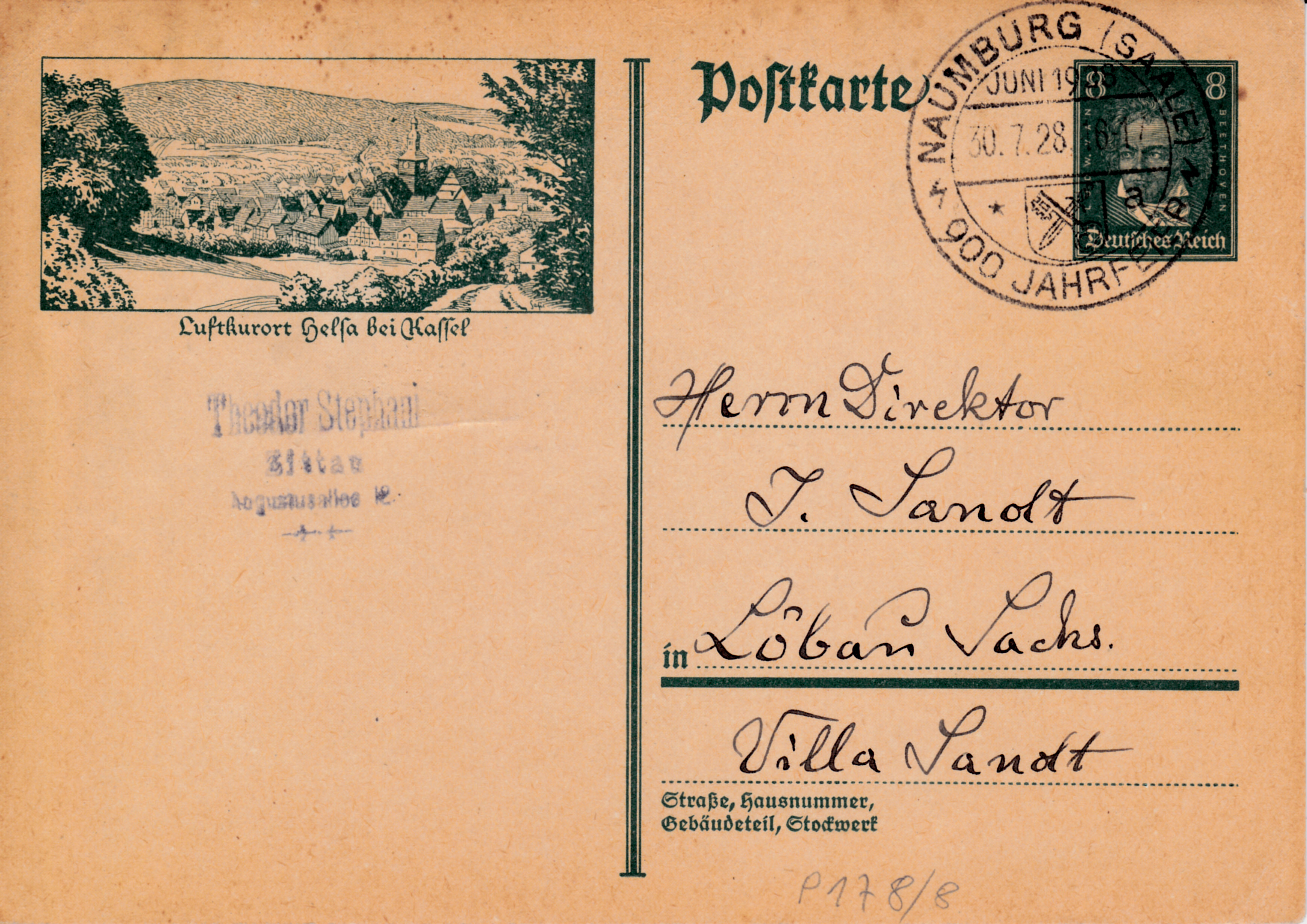 Die Bildpostkarte 1927 MiNr P 178/08 mit dem Wertstempel "Berühmte Deutsche" mit dem Porträt 8Pf zeigt eine Ansicht des Luftkurortes Helsa bei Kassel.