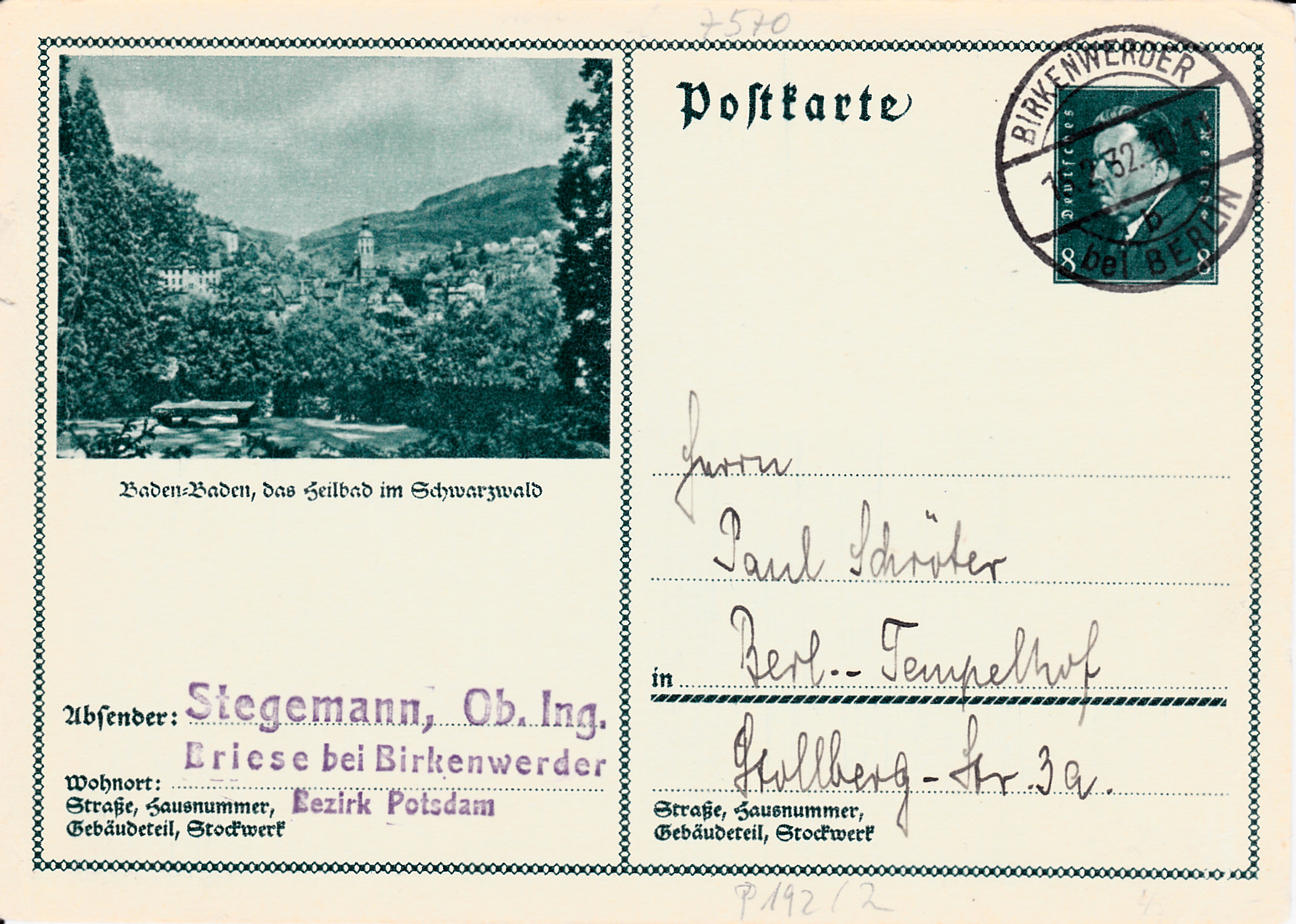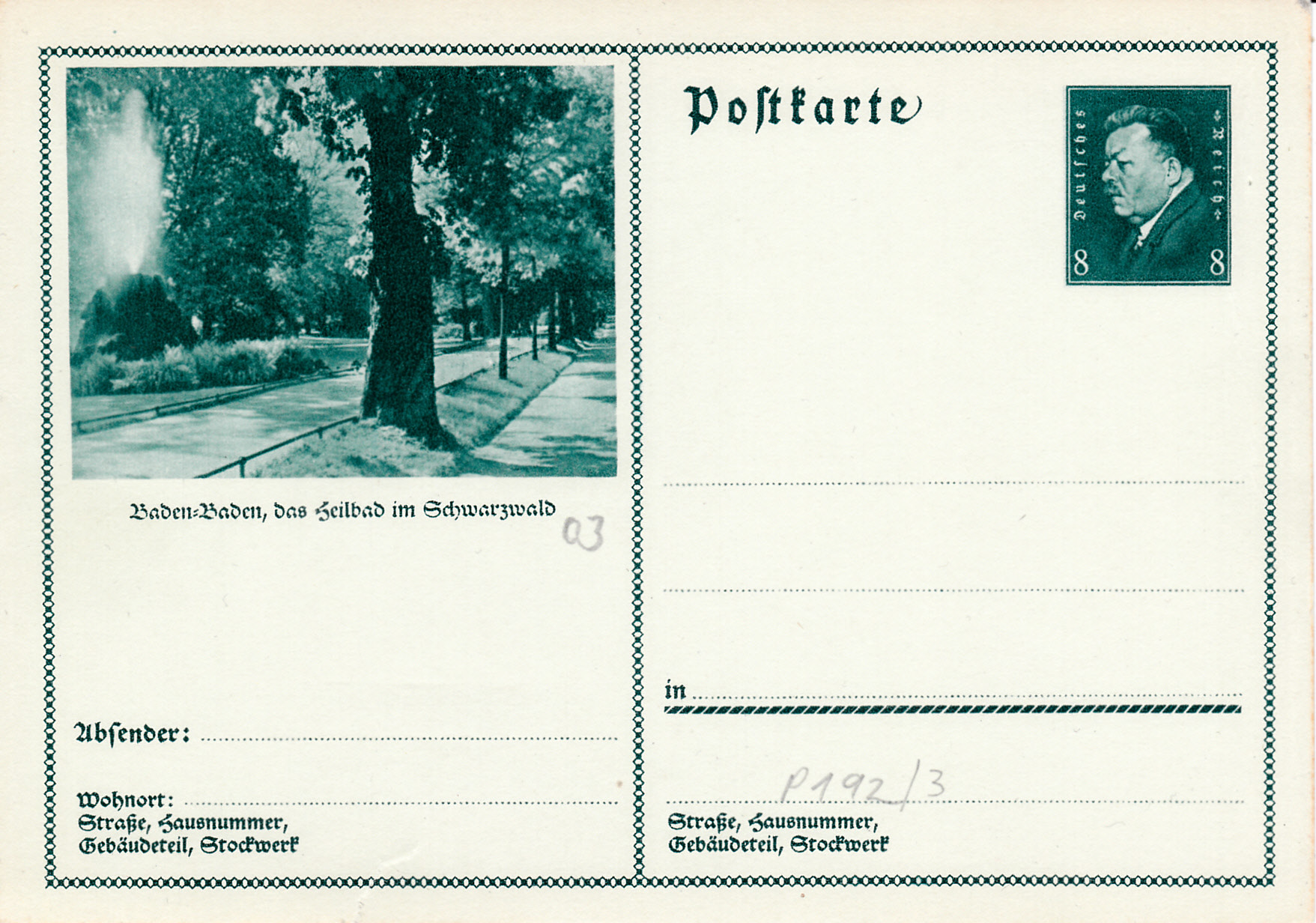 Eine weitere Ansicht aus Baden-Baden wird auf dieser Bildpostkarte (MiNr P 192/03) gezeigt.