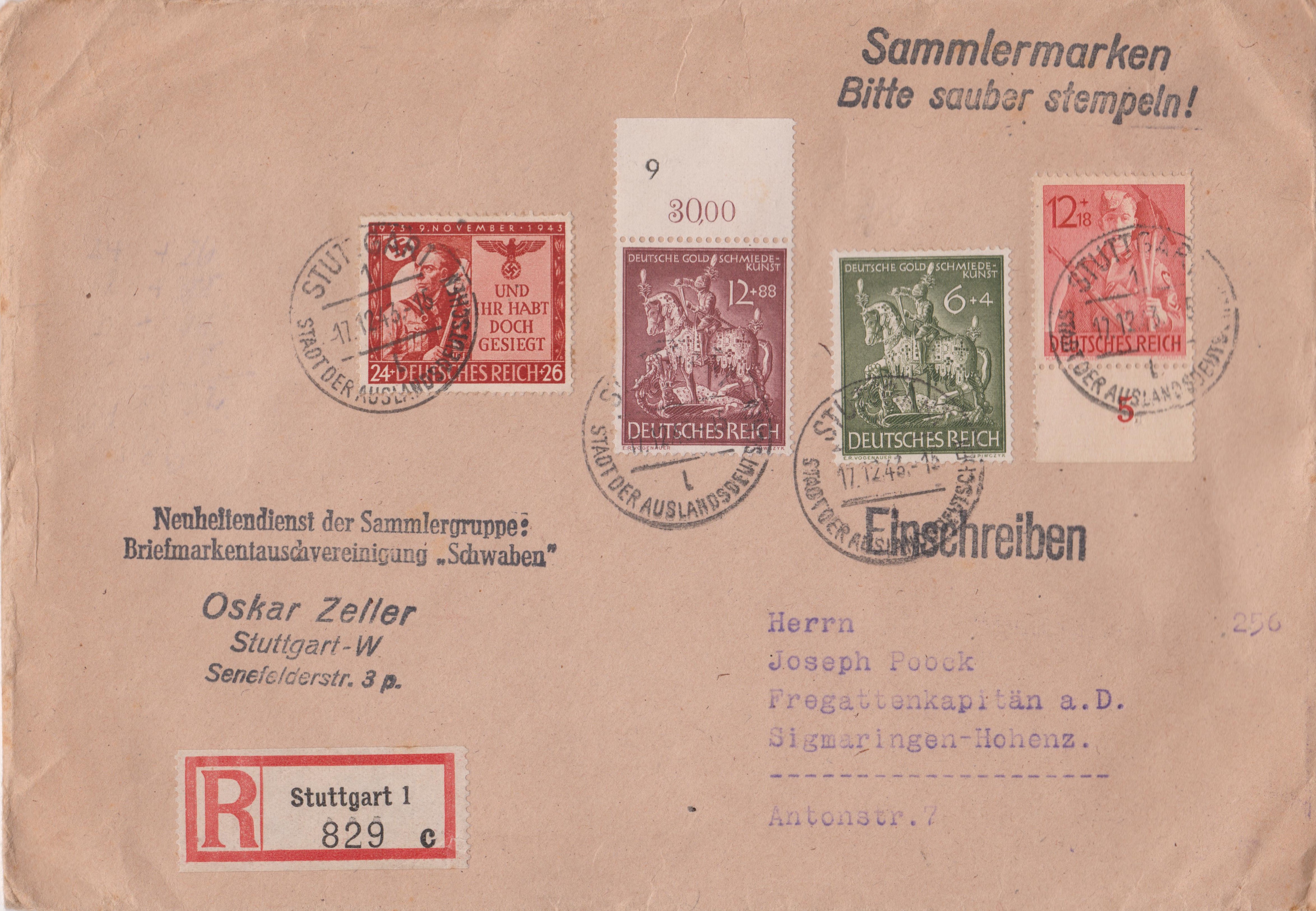 Auch in Absenderfreistempeln wurde in STUTTGART 1 der Zusatz "STADT DER AUSLANDSDEUTSCHEN" aufgenommen wie bei diesem Exemplar vom 08.02.1943: