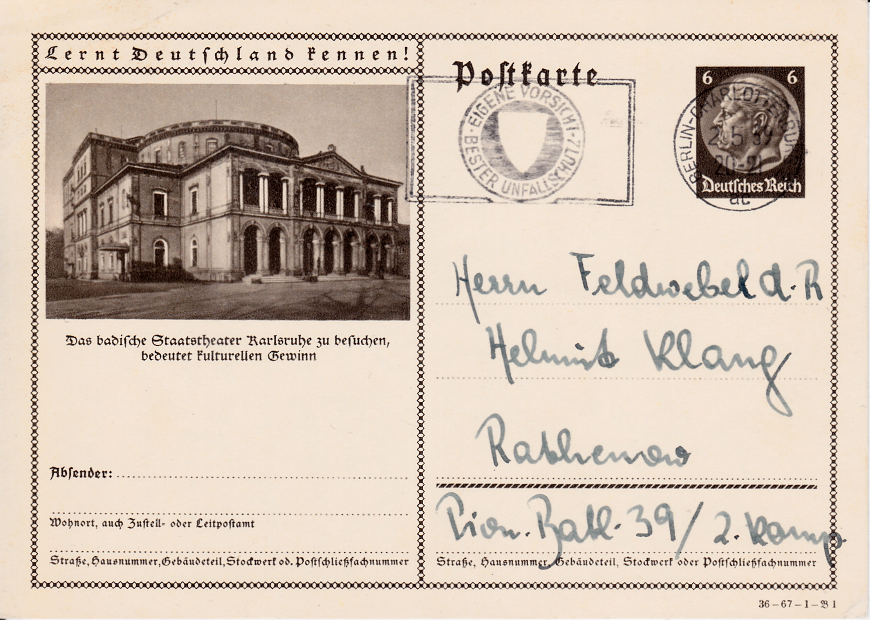 Dieser Jahrgang beginnt mit der Karte mit dem Badischen Staatstheater in Karlsruhe und dem Druckvermerk 36-67-1-B1 (Serie 67 Bild 1).