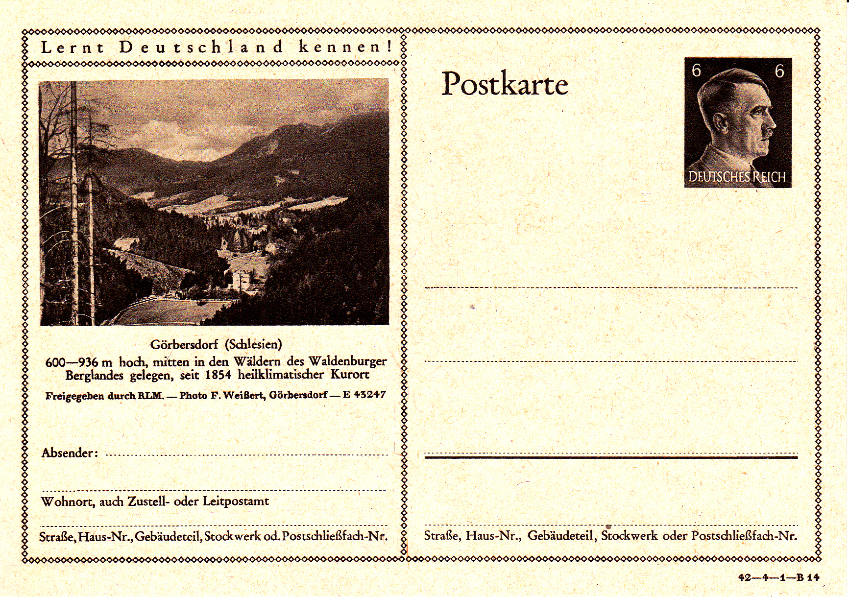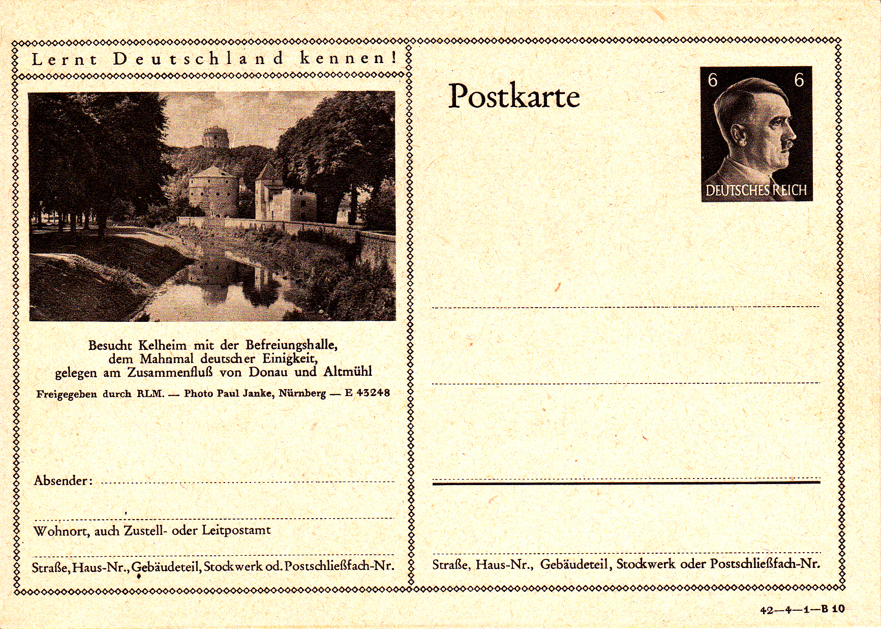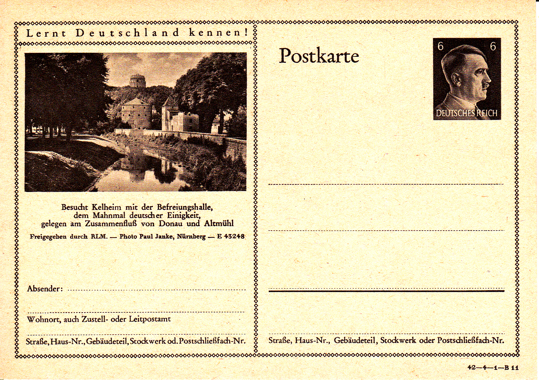 Ich beginne mit der Karte mit dem Druckvermerk 42-4-1-B1 (Ausgabejahr 1942-Serie 4-Druckplatte 1-Bild 1; bei weiteren Karten nenne ich jeweils die Serie und die Bildnummer, die Druckplattennummer nur, wenn es verschiedene Druckplattennummern bei der jeweiligen Serie gibt).