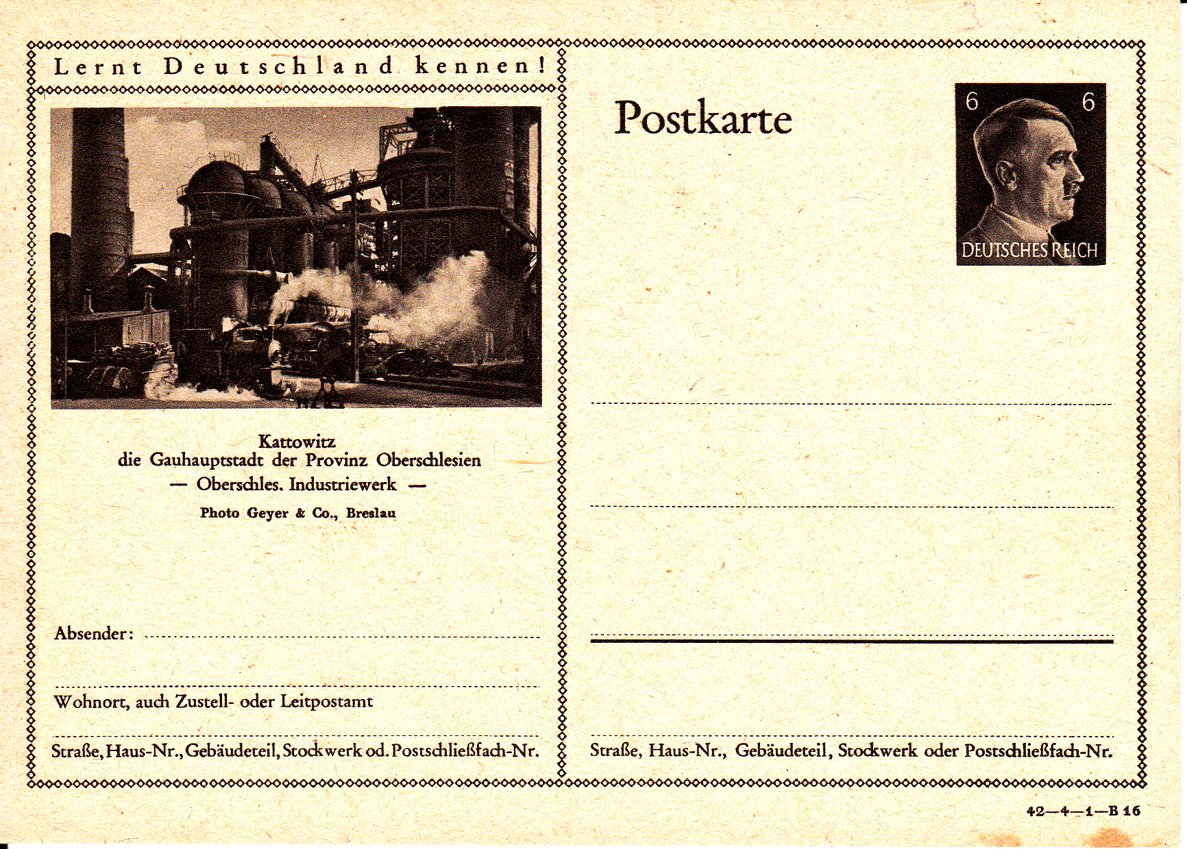 Kattowitz (Oberschlesien) zeigt auf dieser Karte (Serie 4 Bild 16) wie im Vorjahr ein Industriewerk. Kattowitz heißt heute Katowice und ist die Hauptstadt der polnischen Woiwodschaft Schlesien.