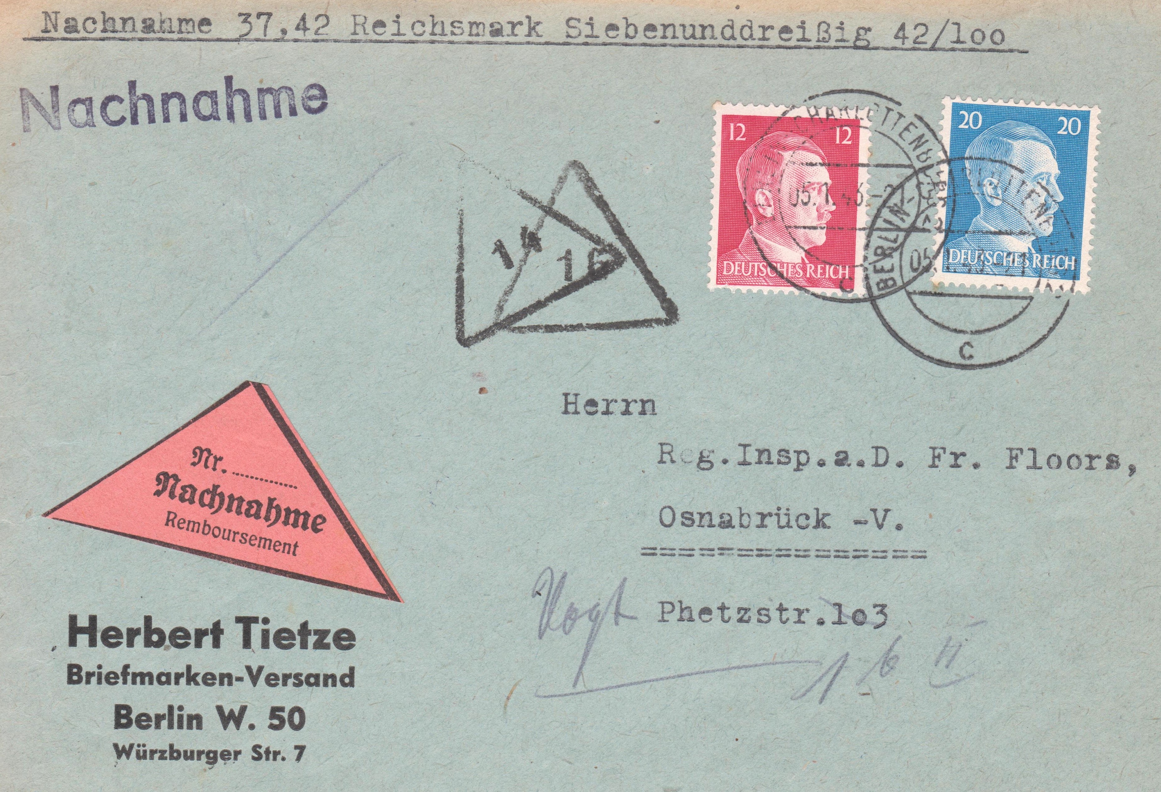 Mischfrankatur 20 Pf und 12 Pf portogerecht auf Brief im Fernverkehr von Berlin nach Osnabrück, Porto 12 Pf, per Nachnahme, Porto 20 Pf, aufgegeben am 05.01.1943: