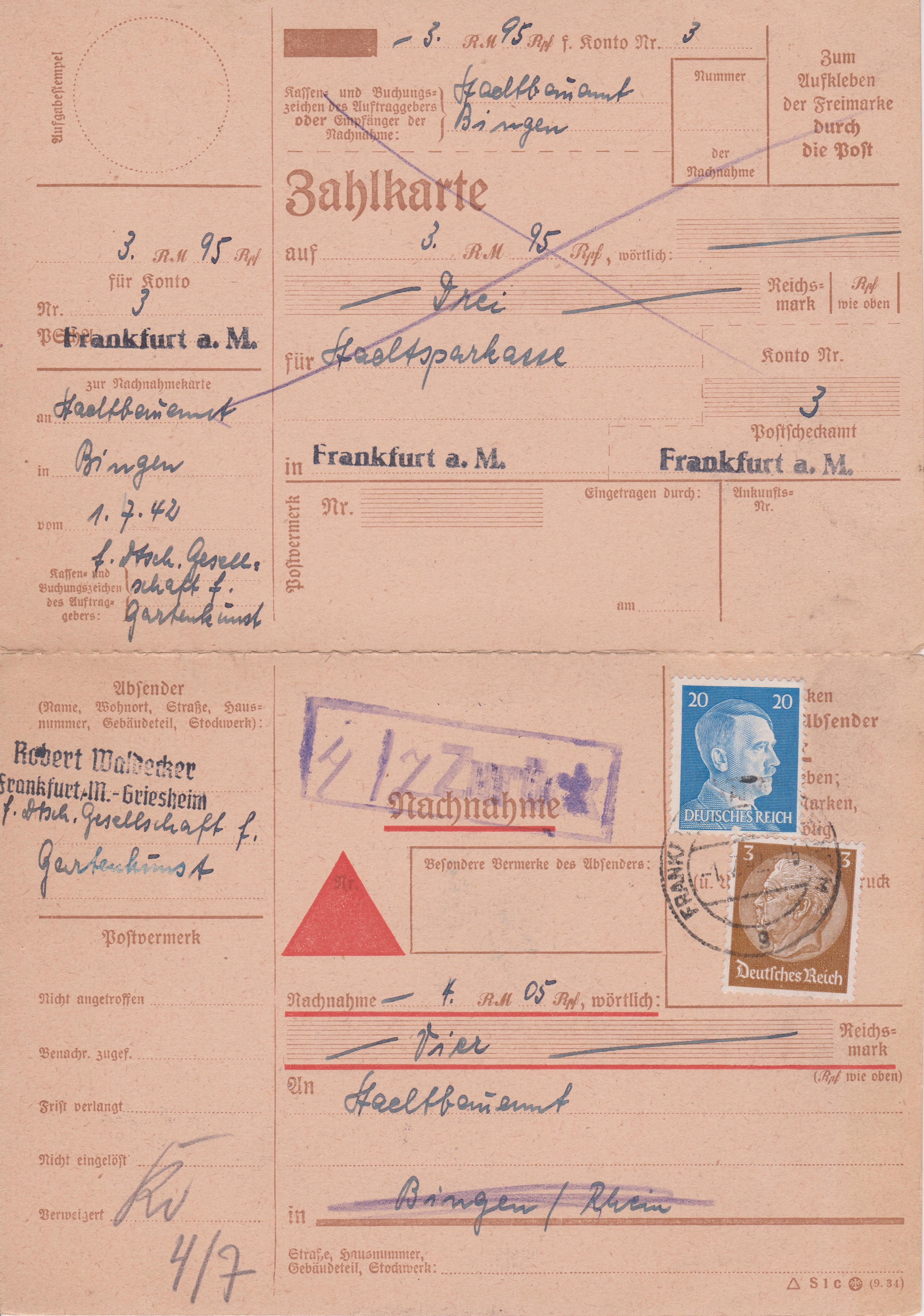 Drucksache, Porto 3 Pf, per Nachnahme, Porto 20 Pf, ergibt die Portostufe 23 Pf, am 01.07.1942 dargestellt per Mischfrankatur 3 Pf Dauerserie Hindenburg Medaillon sowie 20 Pf Dauerserie Adolf Hitler: