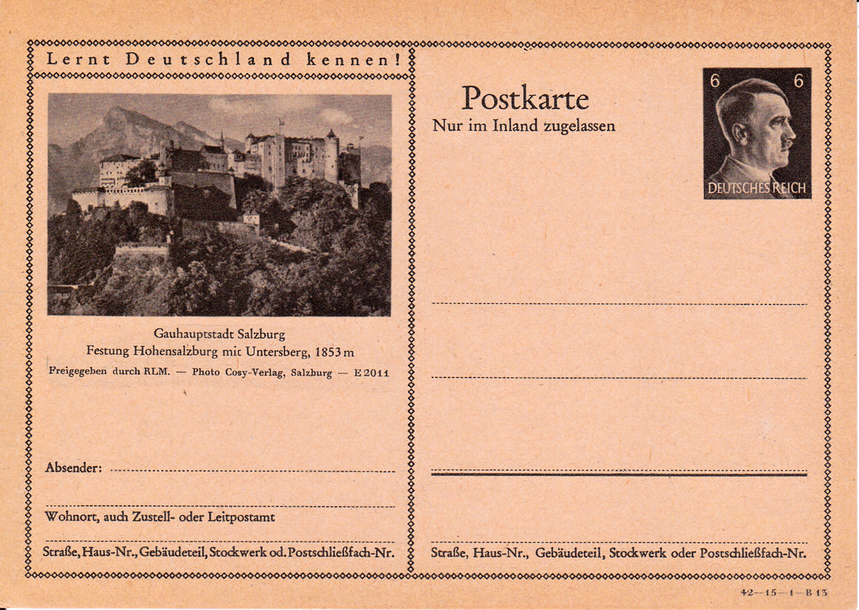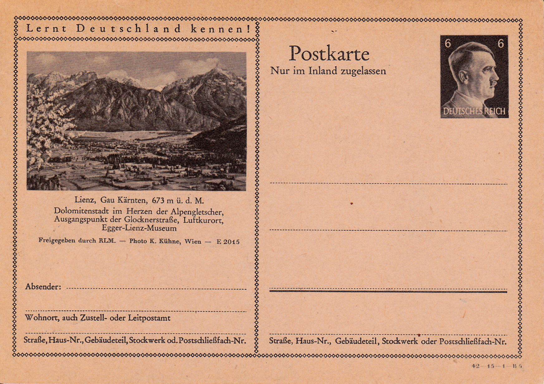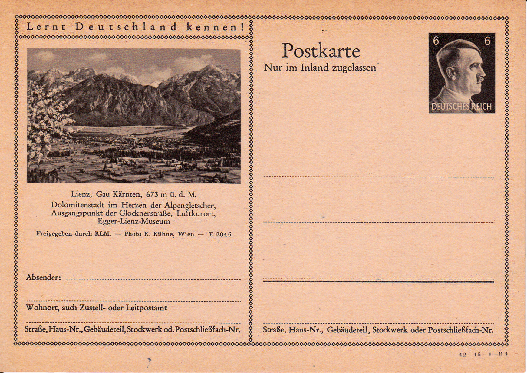 Ich beginne mit der Karte mit dem Druckvermerk 42-15-1-B1 (Ausgabejahr 1942-Serie 15-Druckplatte 1-Bild 1; bei weiteren Karten nenne ich jeweils die Serie und die Bildnummer, die Druckplattennummer nur, wenn es verschiedene Druckplattennummern bei der jeweiligen Serie gibt).