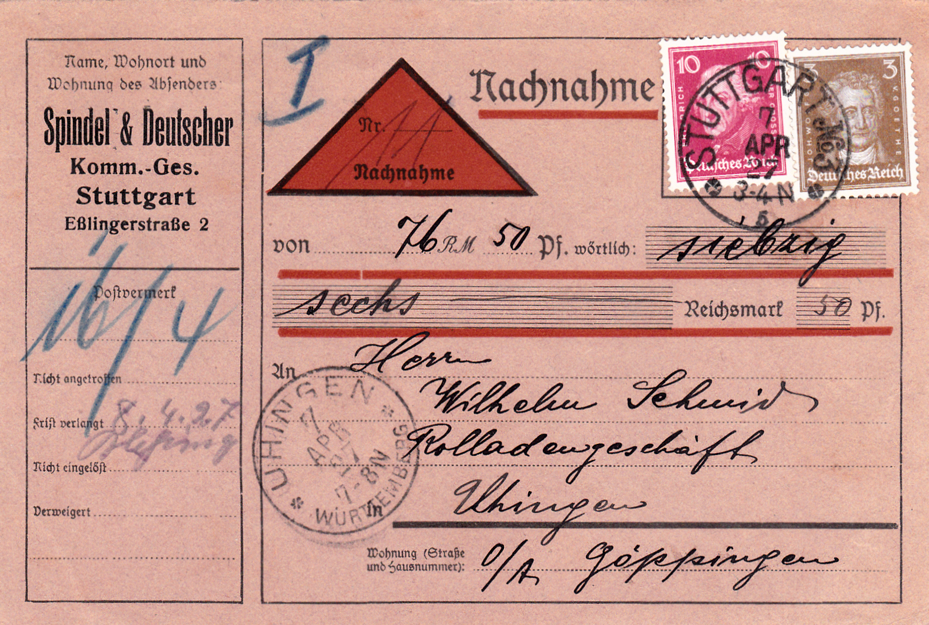 Drucksache in Kartenform, Porto 3 Pf, per Nachnahme, Porto 10 Pf (1.2.1924 bis 31.7.1927), ergibt die Portostufe 13 Pf, hier als Mischfrankatur der Freimarken Berühmte Deutsche, Wertstufen 10 Pf sowie 3 Pf.