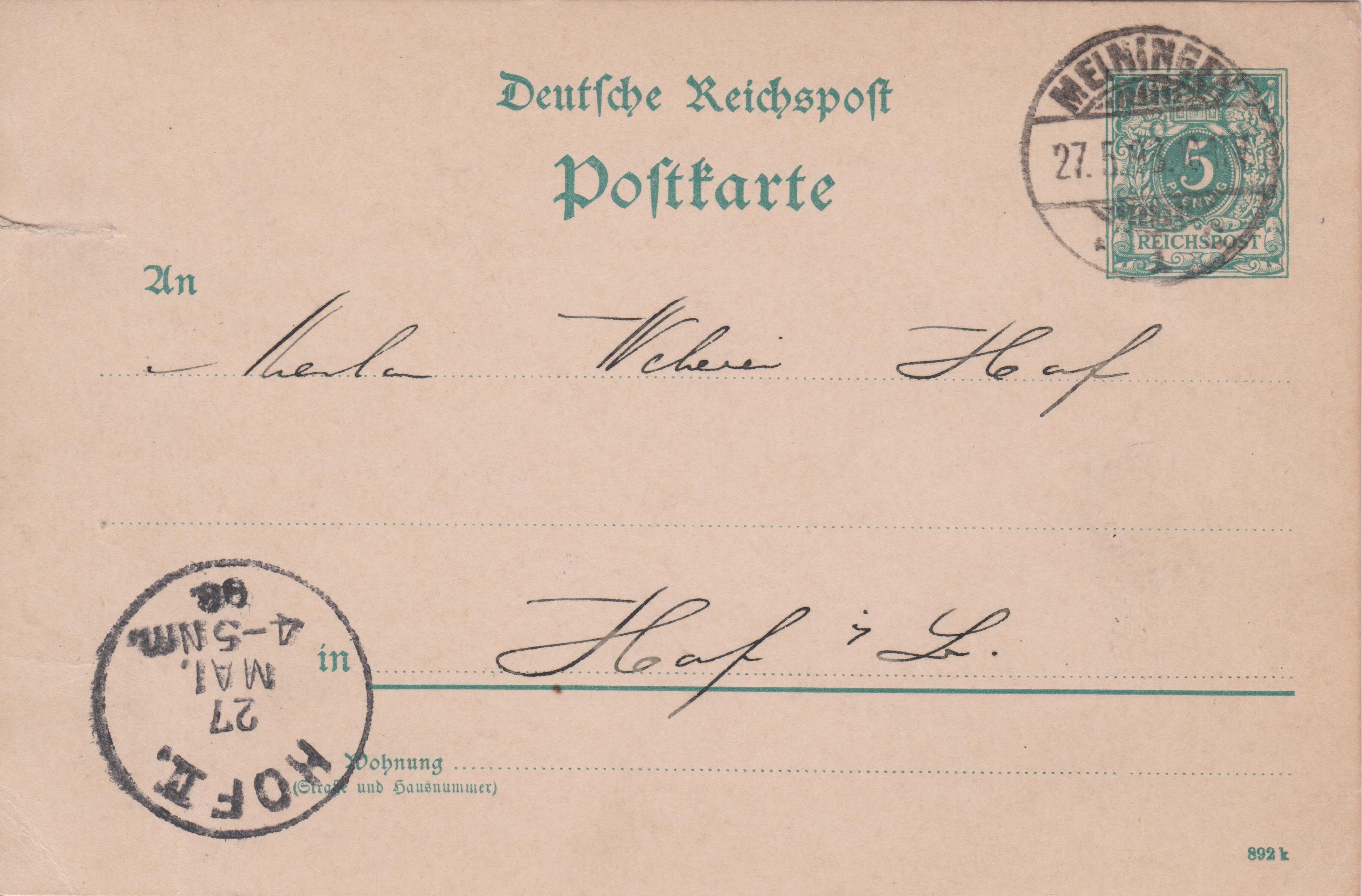 Ganzsache Deutsches Reich P 30 I mit Eindruck 5 Pf Freimarken Wertziffer und Krone im Perlenoval, Druckvermerk 892 k unten rechts: