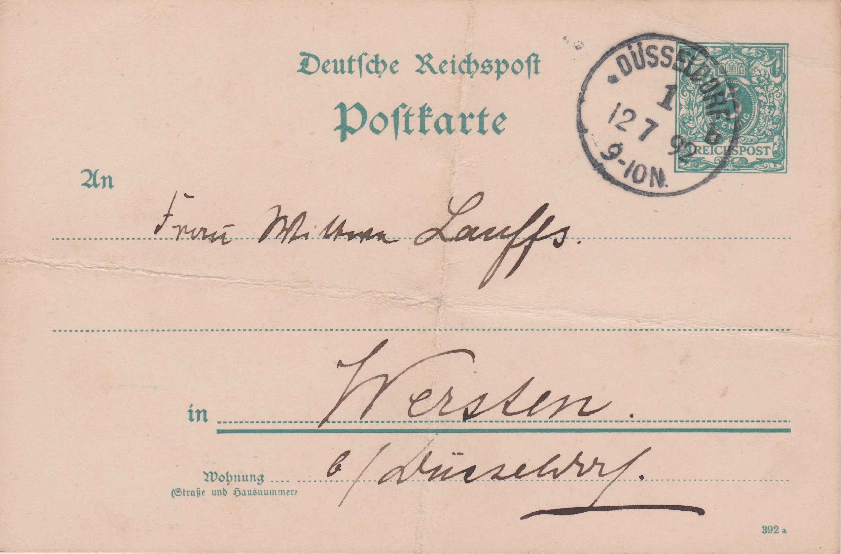 Ganzsache Deutsches Reich P 30 I mit Eindruck 5 Pf Freimarken Wertziffer und Krone im Perlenoval, Druckvermerk 392 a unten rechts: