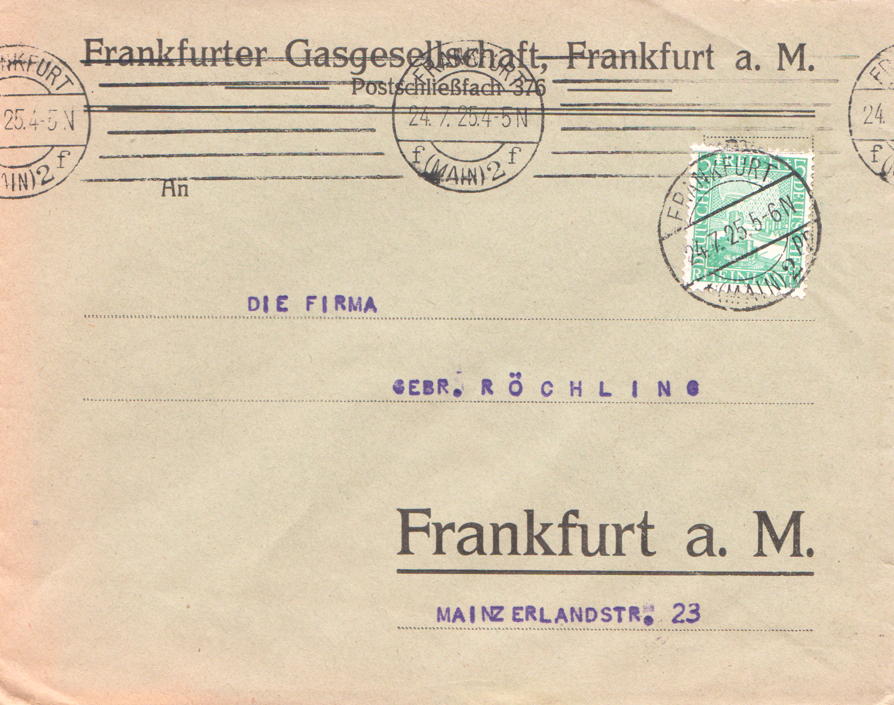 Einzelfrankatur Deutsches Reich MiNr. 372 am 24.07.1925 portogerecht auf Brief im Ortsverkehr: